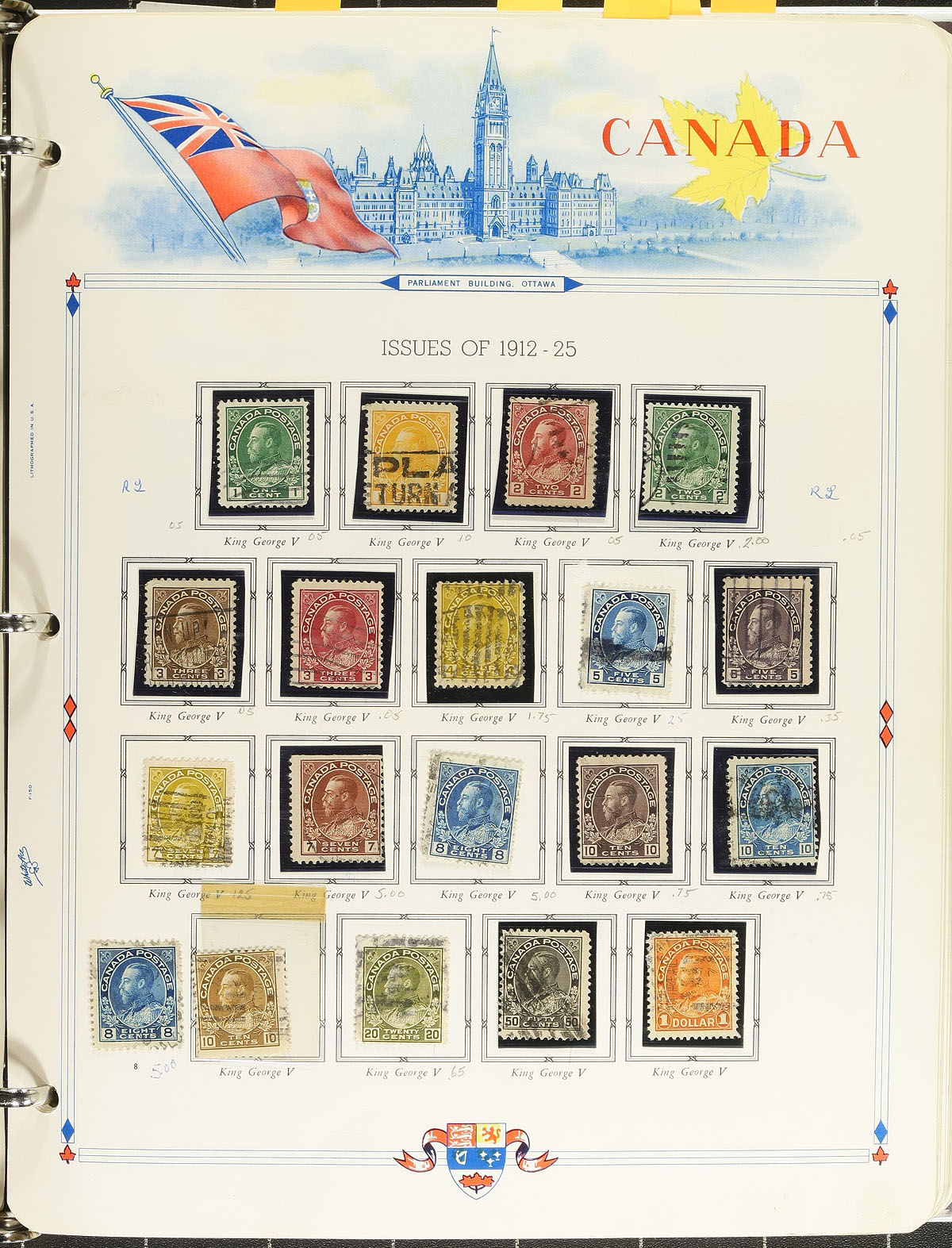 Collection used Canada, 1870's-2019's, containing several hundreds of stamps neatly organized on hundreds of Unity album pages, housed in 9 binders. The collection begins with a small selection of Victorian and Edward issues, and continues with partial sets of Scrolls, Arch, with complete sets of both Pictorials, War, and Peace issues. The collection continues with material up to the 2005, with pages sparsely filled thereafter, with empty pages from 2016 to 2019. A nice starter collection, with the pages alone being worth a few hundred dollars. Estimate =