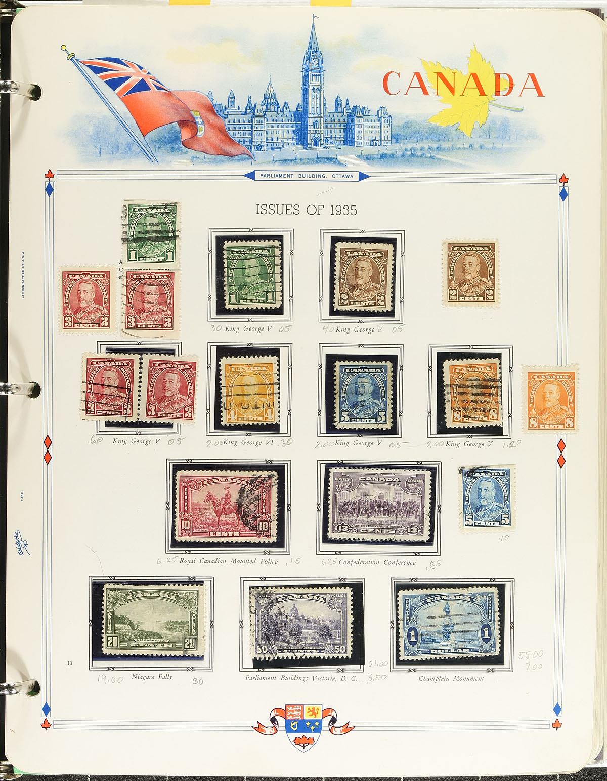 Collection used Canada, 1870's-2019's, containing several hundreds of stamps neatly organized on hundreds of Unity album pages, housed in 9 binders. The collection begins with a small selection of Victorian and Edward issues, and continues with partial sets of Scrolls, Arch, with complete sets of both Pictorials, War, and Peace issues. The collection continues with material up to the 2005, with pages sparsely filled thereafter, with empty pages from 2016 to 2019. A nice starter collection, with the pages alone being worth a few hundred dollars. Estimate =