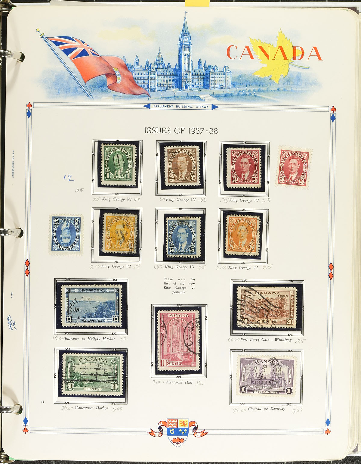 Collection used Canada, 1870's-2019's, containing several hundreds of stamps neatly organized on hundreds of Unity album pages, housed in 9 binders. The collection begins with a small selection of Victorian and Edward issues, and continues with partial sets of Scrolls, Arch, with complete sets of both Pictorials, War, and Peace issues. The collection continues with material up to the 2005, with pages sparsely filled thereafter, with empty pages from 2016 to 2019. A nice starter collection, with the pages alone being worth a few hundred dollars. Estimate =