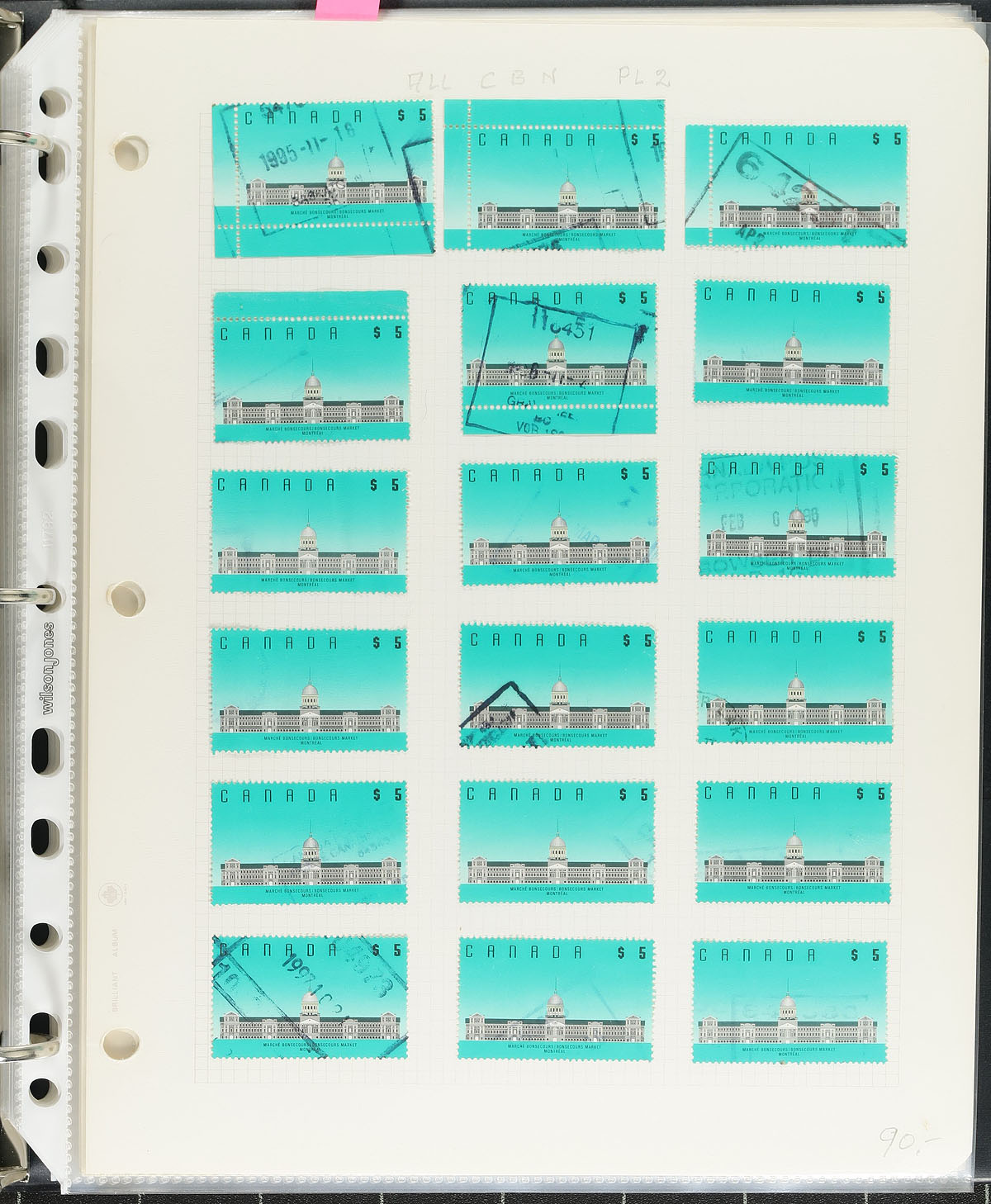 Used stock in 7 stockbooks and a binder, 1870's-2005. The stockbooks are well organized containing several thousands of stamps (including some back of the book and revenue issues), beginning with a small selection of Victorian issues, with strength from the Admirals up to 2005 (includes a few issues post-2005). We encountered a variety of postmarks including cds, split ring, POCON, MOON, and other cancel types, including a few socked on the nose town cancels. The binder contains roughly 20 pages of mostly high denomination definitive issues from the 1970's to the 1980's. A nice lot for the used collector. Estimate =