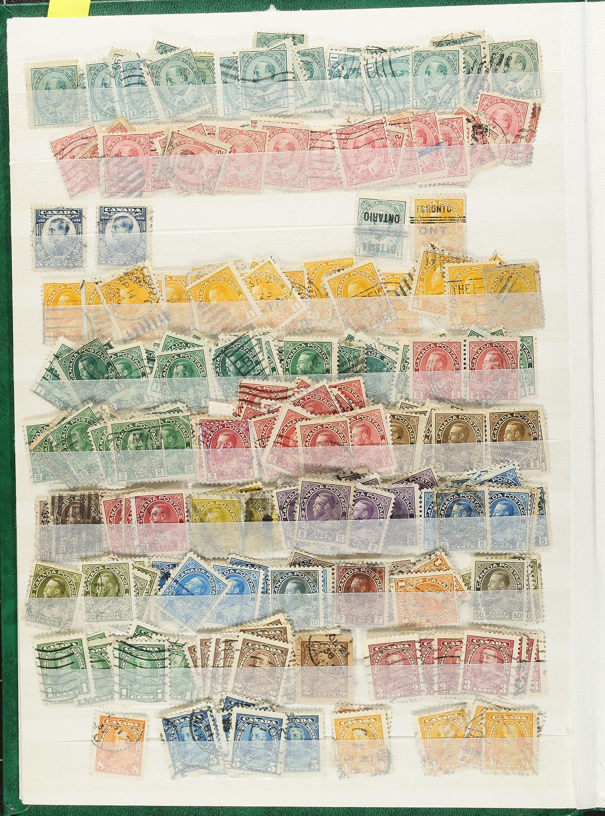 Used stock in 7 stockbooks and a binder, 1870's-2005. The stockbooks are well organized containing several thousands of stamps (including some back of the book and revenue issues), beginning with a small selection of Victorian issues, with strength from the Admirals up to 2005 (includes a few issues post-2005). We encountered a variety of postmarks including cds, split ring, POCON, MOON, and other cancel types, including a few socked on the nose town cancels. The binder contains roughly 20 pages of mostly high denomination definitive issues from the 1970's to the 1980's. A nice lot for the used collector. Estimate =