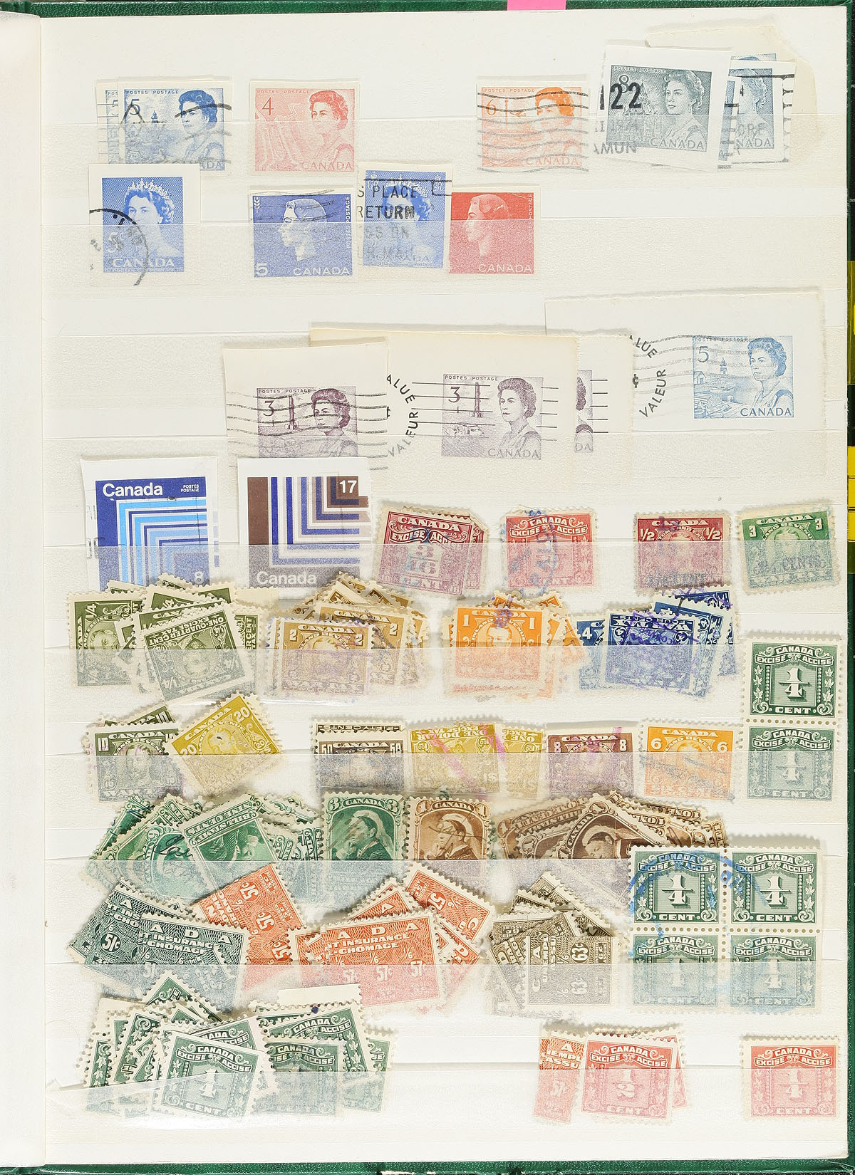 Used stock in 7 stockbooks and a binder, 1870's-2005. The stockbooks are well organized containing several thousands of stamps (including some back of the book and revenue issues), beginning with a small selection of Victorian issues, with strength from the Admirals up to 2005 (includes a few issues post-2005). We encountered a variety of postmarks including cds, split ring, POCON, MOON, and other cancel types, including a few socked on the nose town cancels. The binder contains roughly 20 pages of mostly high denomination definitive issues from the 1970's to the 1980's. A nice lot for the used collector. Estimate =