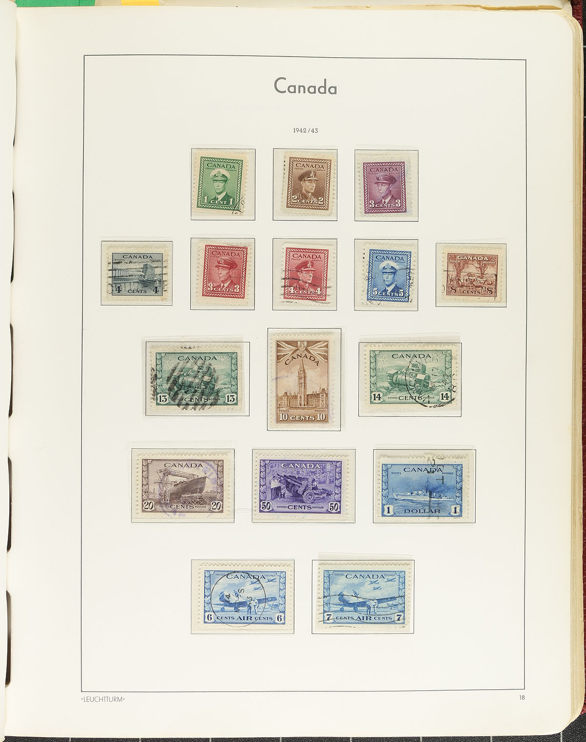 Consignment remainders of used Canada, 1900s-1970s, containing many hundreds of stamps in 3 albums (including a hingeless Lighthouse album), and loose pages. A spot check of material indicated a few Victorian and Edward issues, but primarily sets and partial sets from Admirals up to the 1950's, with complete runs of used up to the 1970's. We note strength in pre-cancels (Admirals to Elizabethan issues) and some back of the book material. A few faults, overall fine to very fine. Estimate =