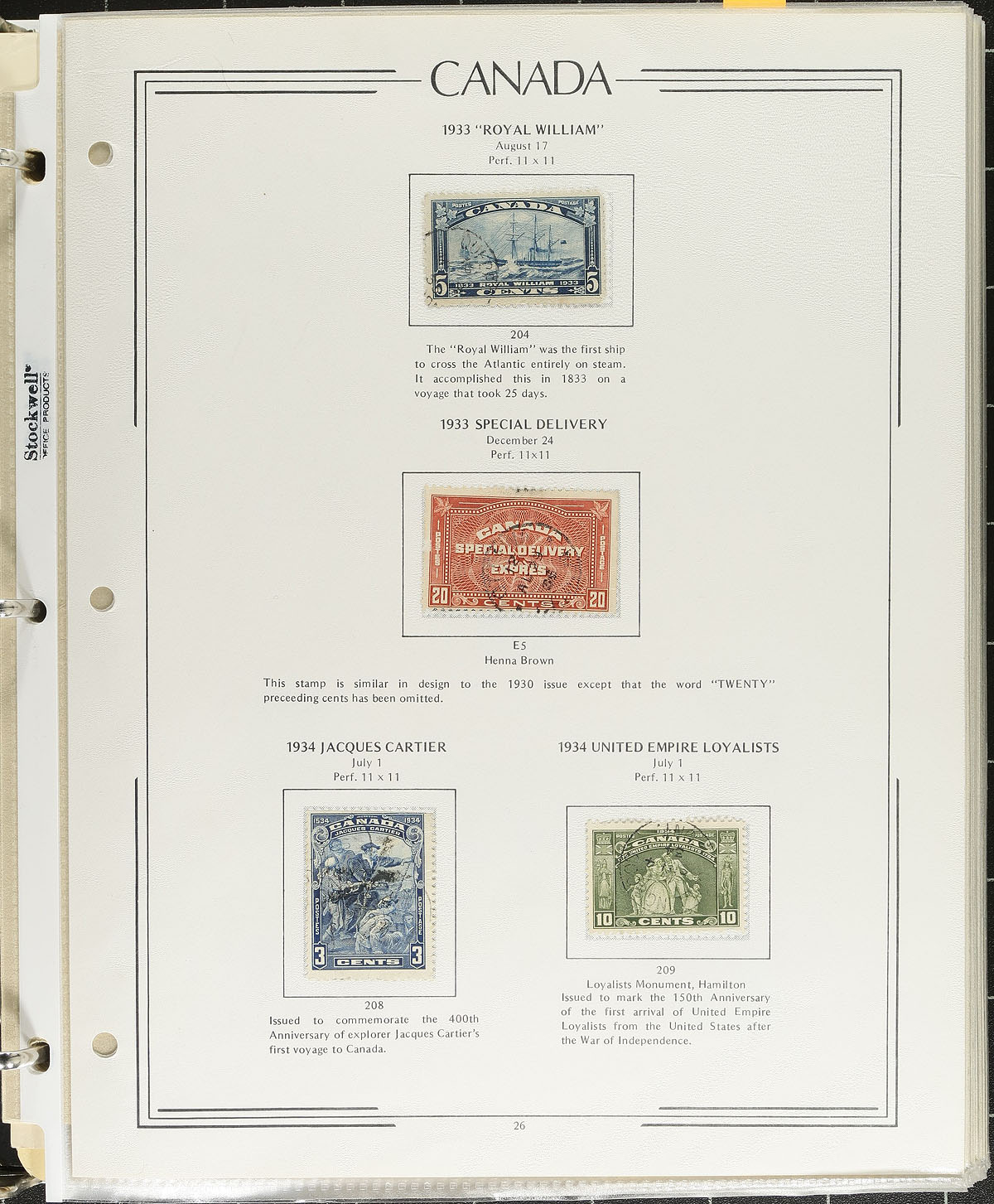 Consignment remainders of used Canada, 1900s-1970s, containing many hundreds of stamps in 3 albums (including a hingeless Lighthouse album), and loose pages. A spot check of material indicated a few Victorian and Edward issues, but primarily sets and partial sets from Admirals up to the 1950's, with complete runs of used up to the 1970's. We note strength in pre-cancels (Admirals to Elizabethan issues) and some back of the book material. A few faults, overall fine to very fine. Estimate =