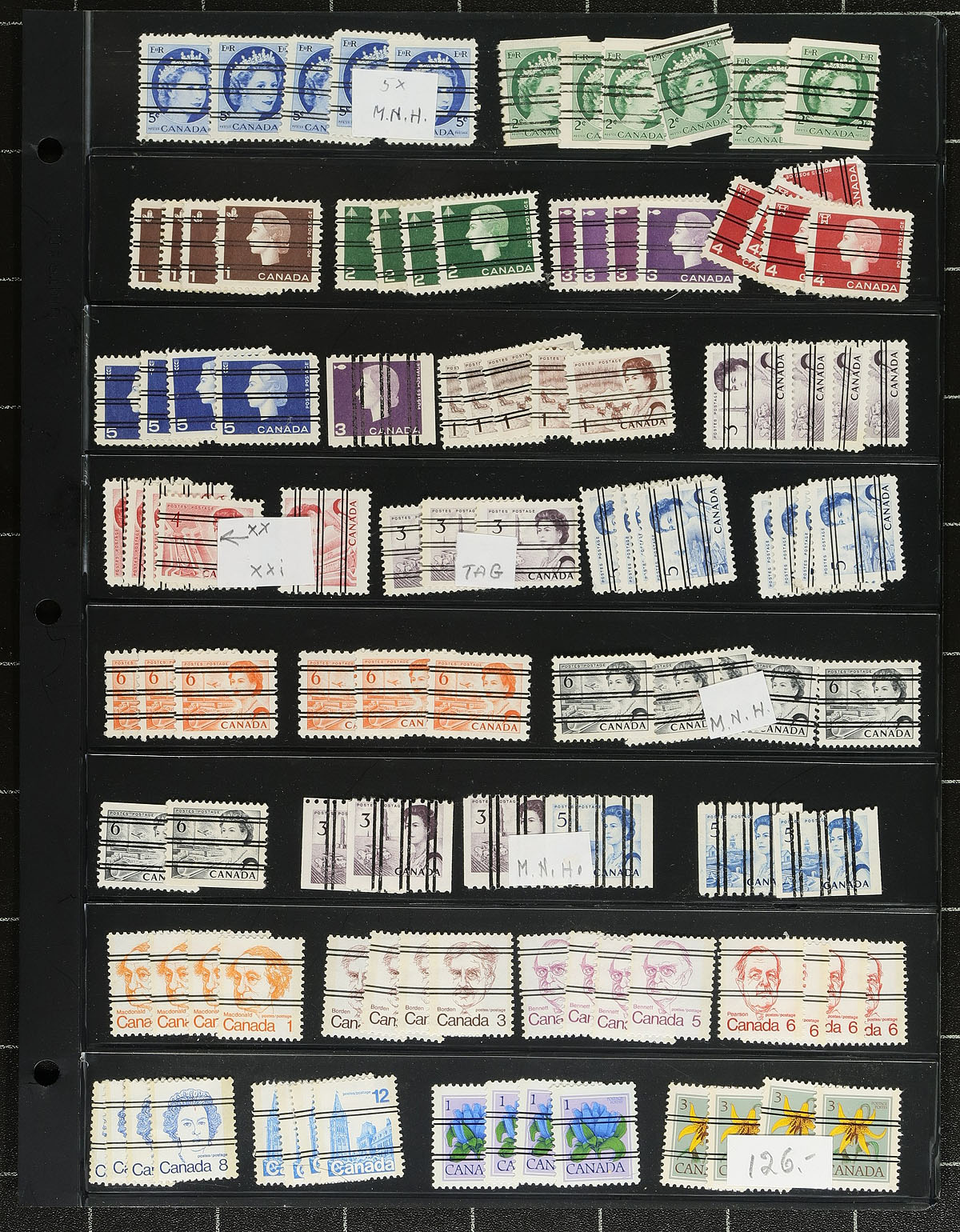 Consignment remainders of used Canada, 1900s-1970s, containing many hundreds of stamps in 3 albums (including a hingeless Lighthouse album), and loose pages. A spot check of material indicated a few Victorian and Edward issues, but primarily sets and partial sets from Admirals up to the 1950's, with complete runs of used up to the 1970's. We note strength in pre-cancels (Admirals to Elizabethan issues) and some back of the book material. A few faults, overall fine to very fine. Estimate =