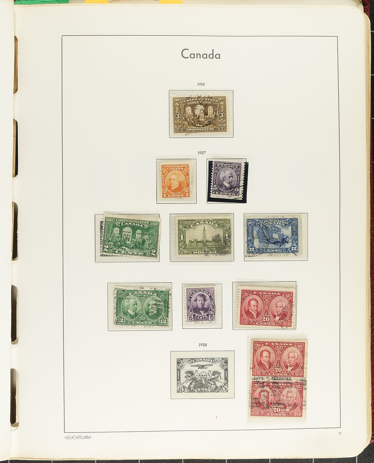Consignment remainders of used Canada, 1900s-1970s, containing many hundreds of stamps in 3 albums (including a hingeless Lighthouse album), and loose pages. A spot check of material indicated a few Victorian and Edward issues, but primarily sets and partial sets from Admirals up to the 1950's, with complete runs of used up to the 1970's. We note strength in pre-cancels (Admirals to Elizabethan issues) and some back of the book material. A few faults, overall fine to very fine. Estimate =