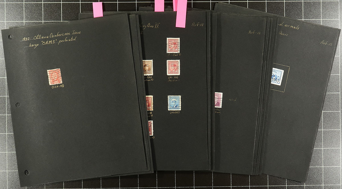 Officials. Small group of used Canada perforated OMHS, on roughly 10 well described album pages, containing 52 stamps ranging from O231/O286, OC6-OC9, and a few other issues. We note a few items cataloguing $10 and up. Online photos show the better pages, overall fine to very fine. 2024 Unitrade =