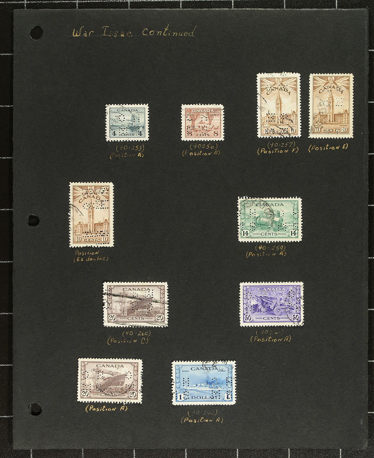Officials. Small group of used Canada perforated OMHS, on roughly 10 well described album pages, containing 52 stamps ranging from O231/O286, OC6-OC9, and a few other issues. We note a few items cataloguing $10 and up. Online photos show the better pages, overall fine to very fine. 2024 Unitrade =