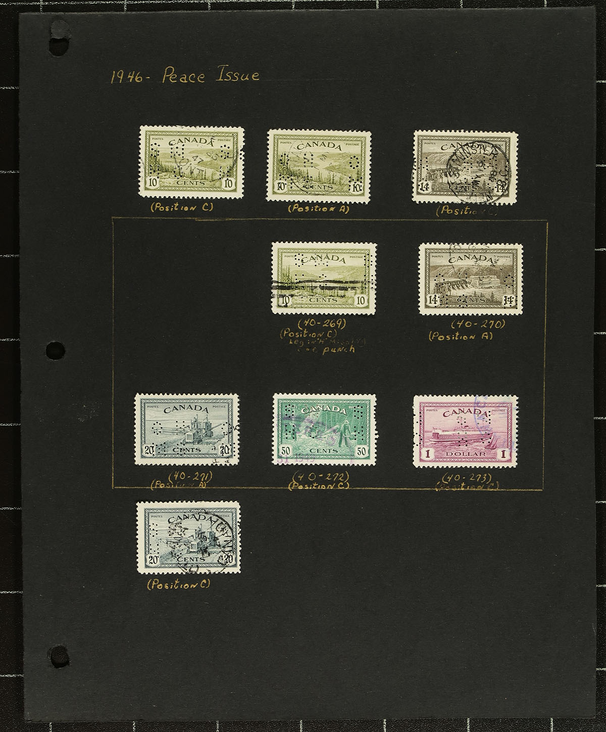 Officials. Small group of used Canada perforated OMHS, on roughly 10 well described album pages, containing 52 stamps ranging from O231/O286, OC6-OC9, and a few other issues. We note a few items cataloguing $10 and up. Online photos show the better pages, overall fine to very fine. 2024 Unitrade =