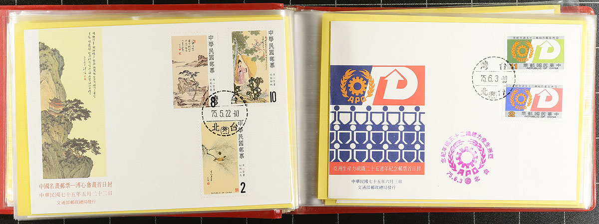 Collection of Republic of China first day cover, 1972-1988, containing 258 covers in neatly organized 5 cover albums. We note singles and sets franking, ranging from Scott #s 1800-2646, which were catalogued as stamps alone (with no added premium for FDC). A nice clean lot. 2025 Scott US$253.00 =