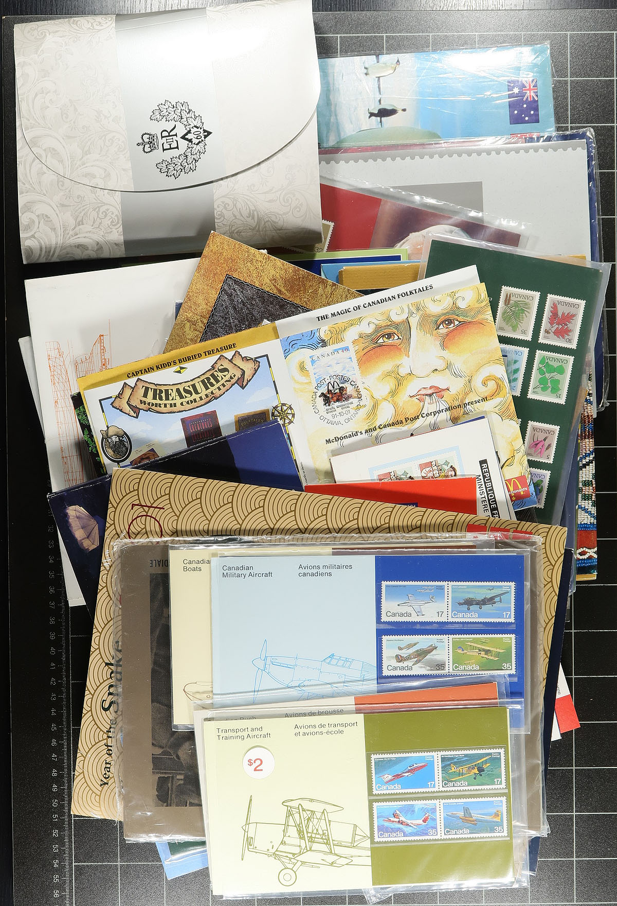 Thematic Packs. A selection of 38 Thematic packs loose in a box, many still sealed, with Unitrade #s 11 (x2), 13 (x2), 15 (x2), 16 (x2), 17-18, 19 (x2), 21-23, 27, 37, 42-43, 46 (x2), 48-51, 53-54, 89 (x4), 98, 169-174. Ideal for any Canada collector looking to tick off a number of these "back of the book" items. 2024 Unitrade =
