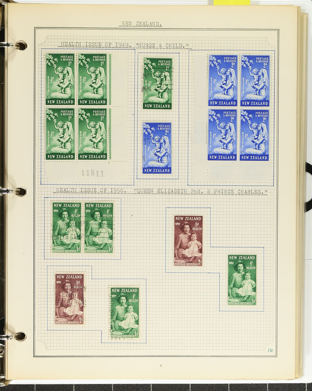Collection of mint and used New Zealand Health issues, 1929-1979, containing a few hundred stamps (including a few miniature sheets), on 36 well described pages housed in a binder. The collection ranges from Scott B1/B105, with an attempt to have a mint and used example for almost every issue, including #s B2 (mh, used, c.v. $75 total), B3-B4 (used, $165 total), along with a few items cataloguing $15 and up. A spot check revealed stamps and sheets having at least 2 hinges (top and bottom of items). Still a fairly complete selection of these issues. Estimate =