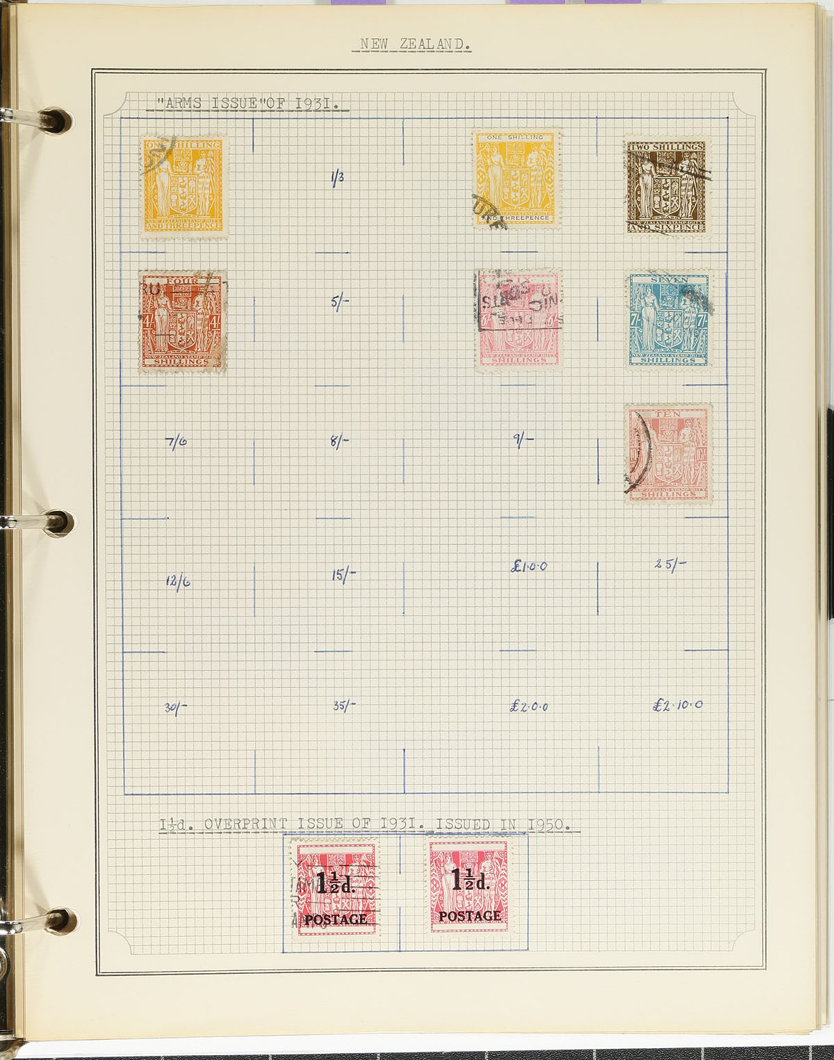 Collection of mint and used New Zealand, 1880's-1979, containing several hundreds of stamps, on roughly 100 well described pages housed in 4 binders. The collection begins with selection of used singles and partial sets up to 1930, with a mixture of mint and used material thereafter, with an attempt by the collector to have a mint and used example for some issues. The lot also includes selections of postal-fiscals, postage dues, and officials. A spot check indicated a few singles and sets cataloguing $20 and up. Condition is mixed with the early issues, with a spot check indicating stamps having at least 2 hinges per item. Still a nice collection, with online photos showing a sampling. Estimate =