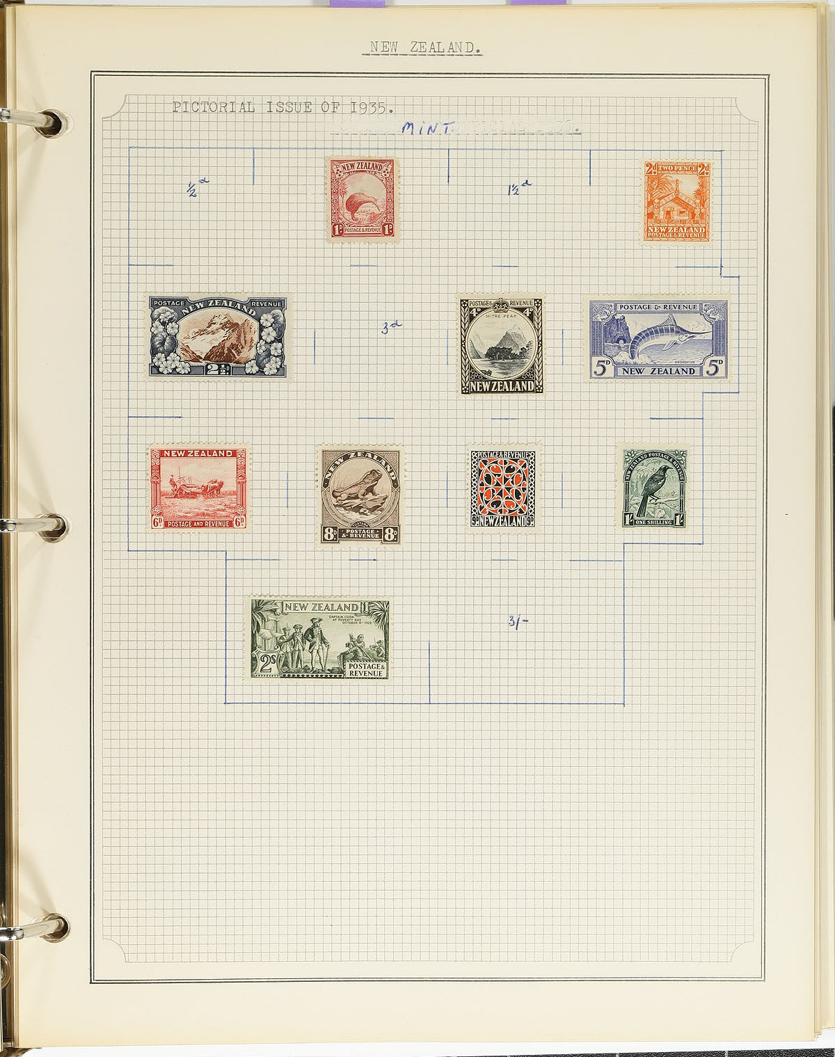 Collection of mint and used New Zealand, 1880's-1979, containing several hundreds of stamps, on roughly 100 well described pages housed in 4 binders. The collection begins with selection of used singles and partial sets up to 1930, with a mixture of mint and used material thereafter, with an attempt by the collector to have a mint and used example for some issues. The lot also includes selections of postal-fiscals, postage dues, and officials. A spot check indicated a few singles and sets cataloguing $20 and up. Condition is mixed with the early issues, with a spot check indicating stamps having at least 2 hinges per item. Still a nice collection, with online photos showing a sampling. Estimate =