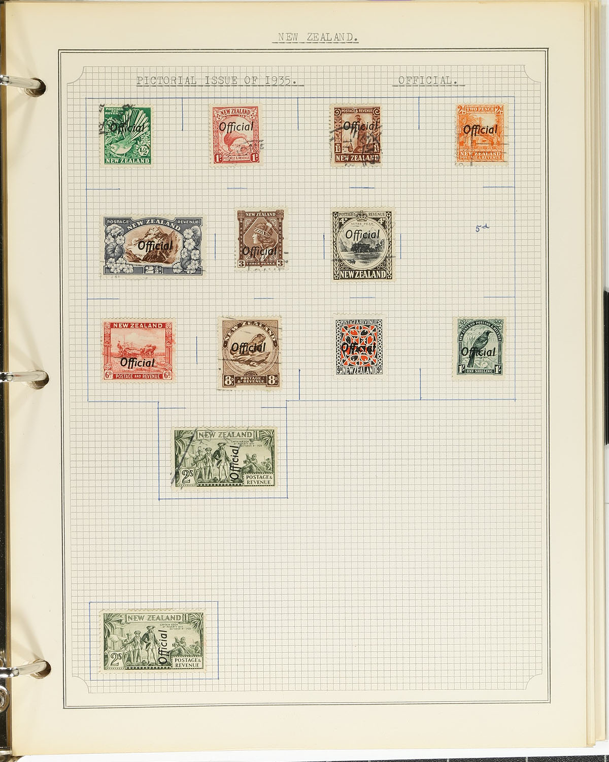 Collection of mint and used New Zealand, 1880's-1979, containing several hundreds of stamps, on roughly 100 well described pages housed in 4 binders. The collection begins with selection of used singles and partial sets up to 1930, with a mixture of mint and used material thereafter, with an attempt by the collector to have a mint and used example for some issues. The lot also includes selections of postal-fiscals, postage dues, and officials. A spot check indicated a few singles and sets cataloguing $20 and up. Condition is mixed with the early issues, with a spot check indicating stamps having at least 2 hinges per item. Still a nice collection, with online photos showing a sampling. Estimate =