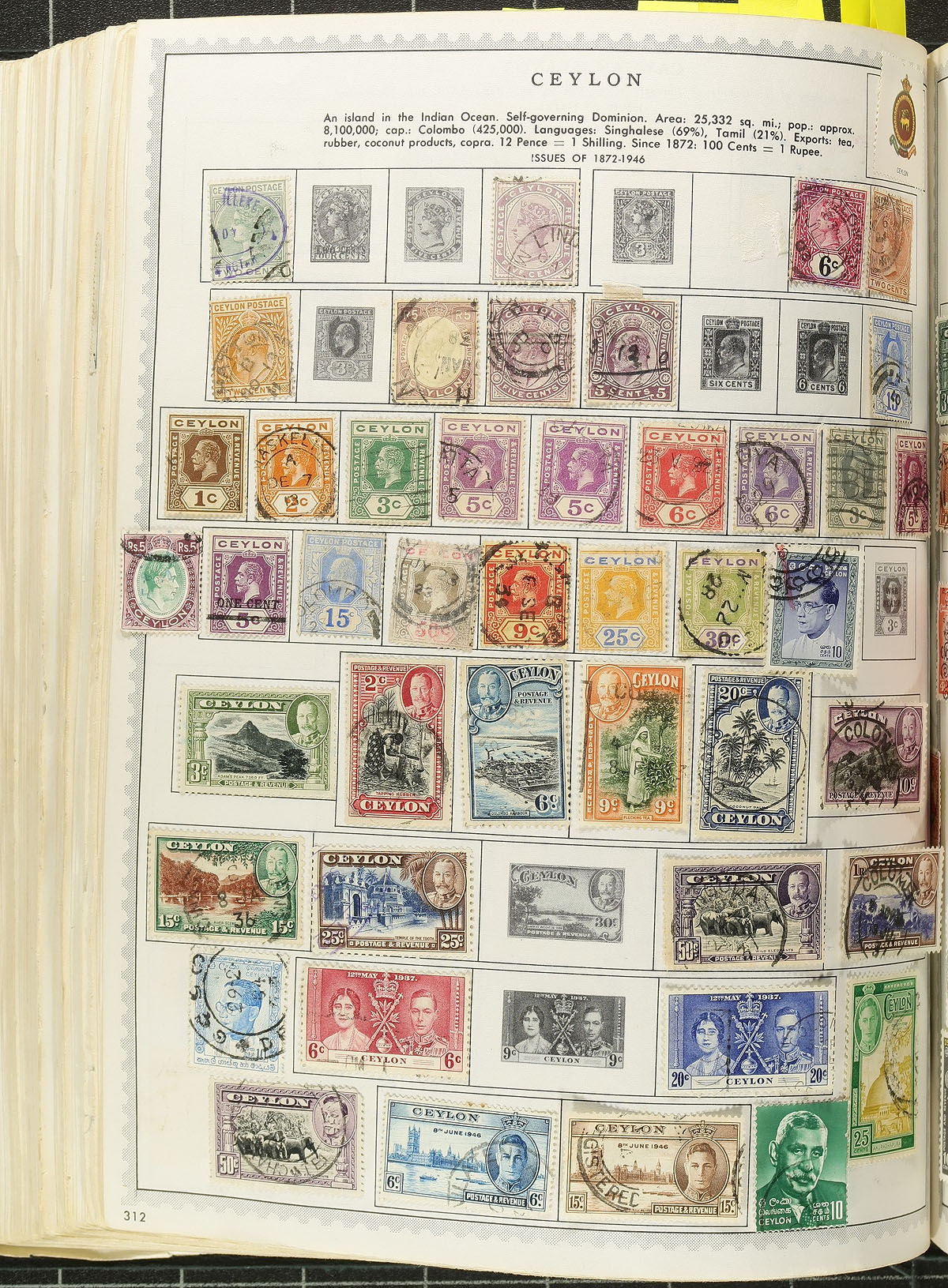 Large worldwide collection in a thick "Comprehensive World-wide Stamp Album" (published by Minkus, 1956), containing many thousands of primarily used stamps from A to V countries, ranging from the 1850's to 1950. A spot check indicated several full pages of stamps, with better representation from European countries (Belgium, Germany, Hungary, Switzerland, to name just a few), France and French Colonies, British Commonwealth, and much more, with some stamps cataloguing in the $5 and up, leaving finds to the dedicated collector. Postmark interest includes CDS and other town postmarks types. A nice lot for the worldwide collector, with photos showing a sampling. Estimate =