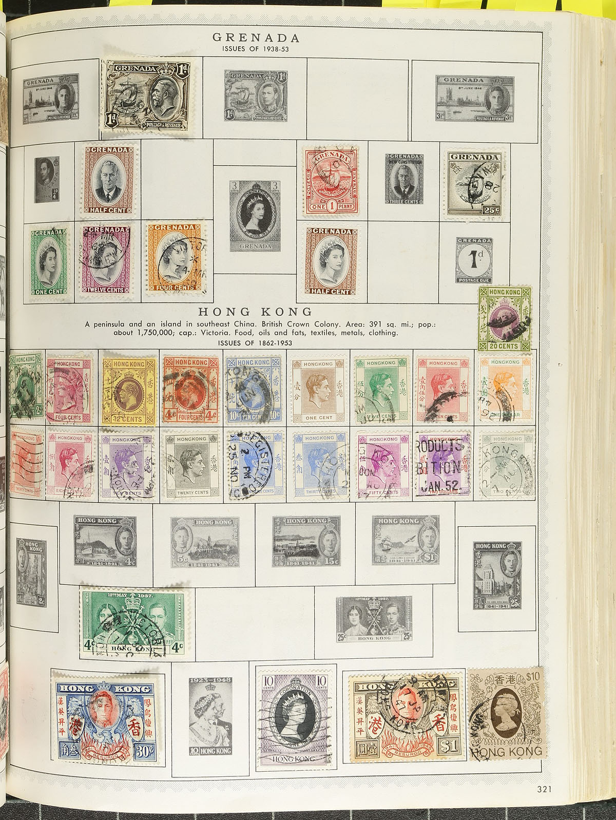 Large worldwide collection in a thick "Comprehensive World-wide Stamp Album" (published by Minkus, 1956), containing many thousands of primarily used stamps from A to V countries, ranging from the 1850's to 1950. A spot check indicated several full pages of stamps, with better representation from European countries (Belgium, Germany, Hungary, Switzerland, to name just a few), France and French Colonies, British Commonwealth, and much more, with some stamps cataloguing in the $5 and up, leaving finds to the dedicated collector. Postmark interest includes CDS and other town postmarks types. A nice lot for the worldwide collector, with photos showing a sampling. Estimate =