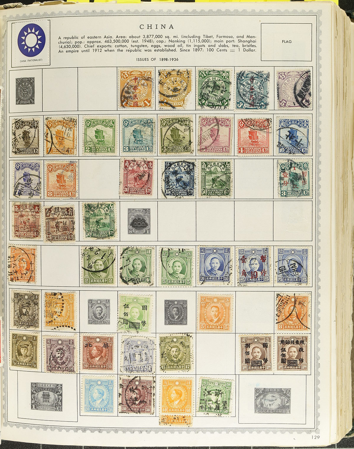 Large worldwide collection in a thick "Comprehensive World-wide Stamp Album" (published by Minkus, 1956), containing many thousands of primarily used stamps from A to V countries, ranging from the 1850's to 1950. A spot check indicated several full pages of stamps, with better representation from European countries (Belgium, Germany, Hungary, Switzerland, to name just a few), France and French Colonies, British Commonwealth, and much more, with some stamps cataloguing in the $5 and up, leaving finds to the dedicated collector. Postmark interest includes CDS and other town postmarks types. A nice lot for the worldwide collector, with photos showing a sampling. Estimate =