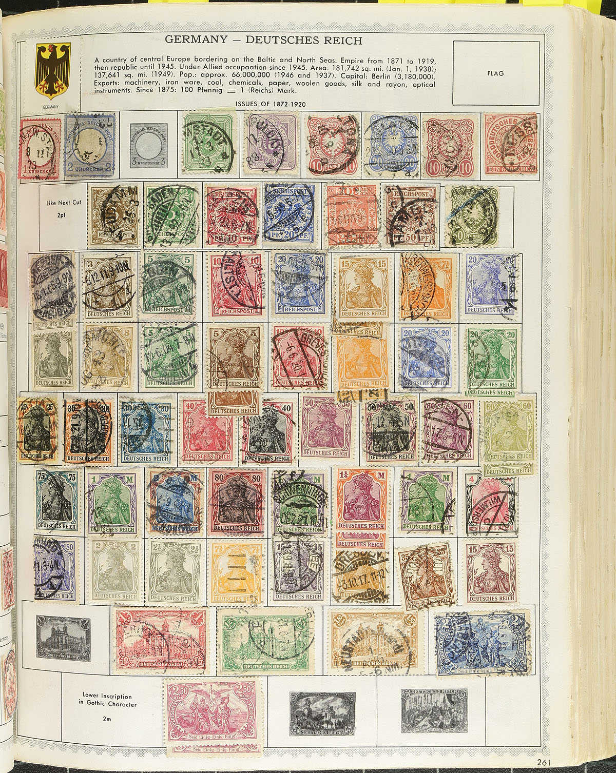 Large worldwide collection in a thick "Comprehensive World-wide Stamp Album" (published by Minkus, 1956), containing many thousands of primarily used stamps from A to V countries, ranging from the 1850's to 1950. A spot check indicated several full pages of stamps, with better representation from European countries (Belgium, Germany, Hungary, Switzerland, to name just a few), France and French Colonies, British Commonwealth, and much more, with some stamps cataloguing in the $5 and up, leaving finds to the dedicated collector. Postmark interest includes CDS and other town postmarks types. A nice lot for the worldwide collector, with photos showing a sampling. Estimate =