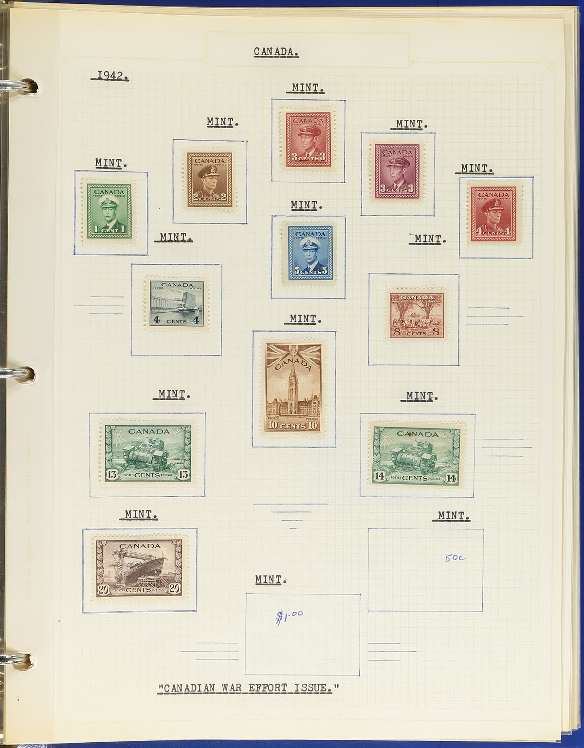 Collection of mint and used Canada, 1870's-1976, containing several hundreds of stamps (probably over 1,000), on a few hundred well described pages, housed in 16 binders. This well organized collection begins with selections of used stamps up to the Edwards, a used set of Admirals, and progress to mint and or used singles, sets and partial sets up to 1950 (the collector made an attempt to get a mint and used example for most issues), noting used sets of Scrolls, War, and Peace issues. The collection includes primarily mint plate blocks, coils, booklet panes, officials post 1950. A spot check indicated stamps and a few sets and partial sets cataloguing $15 and up, with all items appearing to have 2 hinges or more. A well organized collection. Estimate =