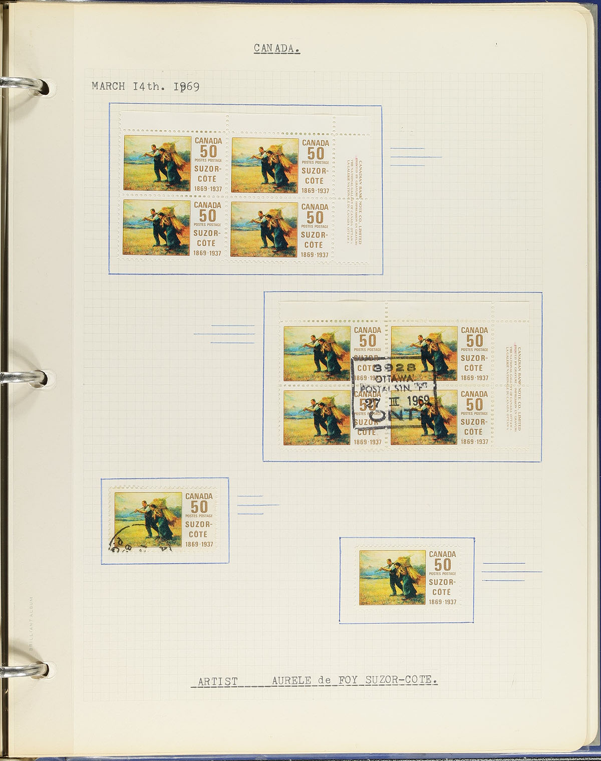 Collection of mint and used Canada, 1870's-1976, containing several hundreds of stamps (probably over 1,000), on a few hundred well described pages, housed in 16 binders. This well organized collection begins with selections of used stamps up to the Edwards, a used set of Admirals, and progress to mint and or used singles, sets and partial sets up to 1950 (the collector made an attempt to get a mint and used example for most issues), noting used sets of Scrolls, War, and Peace issues. The collection includes primarily mint plate blocks, coils, booklet panes, officials post 1950. A spot check indicated stamps and a few sets and partial sets cataloguing $15 and up, with all items appearing to have 2 hinges or more. A well organized collection. Estimate =