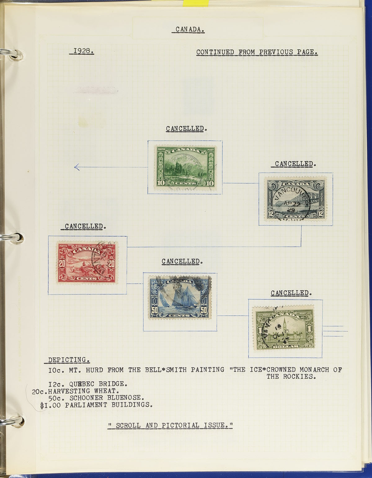 Collection of mint and used Canada, 1870's-1976, containing several hundreds of stamps (probably over 1,000), on a few hundred well described pages, housed in 16 binders. This well organized collection begins with selections of used stamps up to the Edwards, a used set of Admirals, and progress to mint and or used singles, sets and partial sets up to 1950 (the collector made an attempt to get a mint and used example for most issues), noting used sets of Scrolls, War, and Peace issues. The collection includes primarily mint plate blocks, coils, booklet panes, officials post 1950. A spot check indicated stamps and a few sets and partial sets cataloguing $15 and up, with all items appearing to have 2 hinges or more. A well organized collection. Estimate =