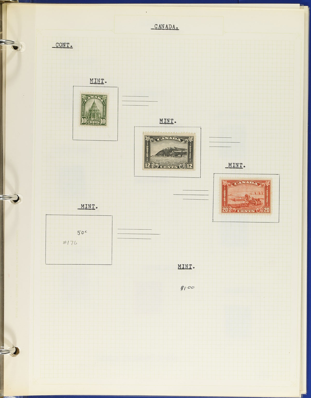Collection of mint and used Canada, 1870's-1976, containing several hundreds of stamps (probably over 1,000), on a few hundred well described pages, housed in 16 binders. This well organized collection begins with selections of used stamps up to the Edwards, a used set of Admirals, and progress to mint and or used singles, sets and partial sets up to 1950 (the collector made an attempt to get a mint and used example for most issues), noting used sets of Scrolls, War, and Peace issues. The collection includes primarily mint plate blocks, coils, booklet panes, officials post 1950. A spot check indicated stamps and a few sets and partial sets cataloguing $15 and up, with all items appearing to have 2 hinges or more. A well organized collection. Estimate =