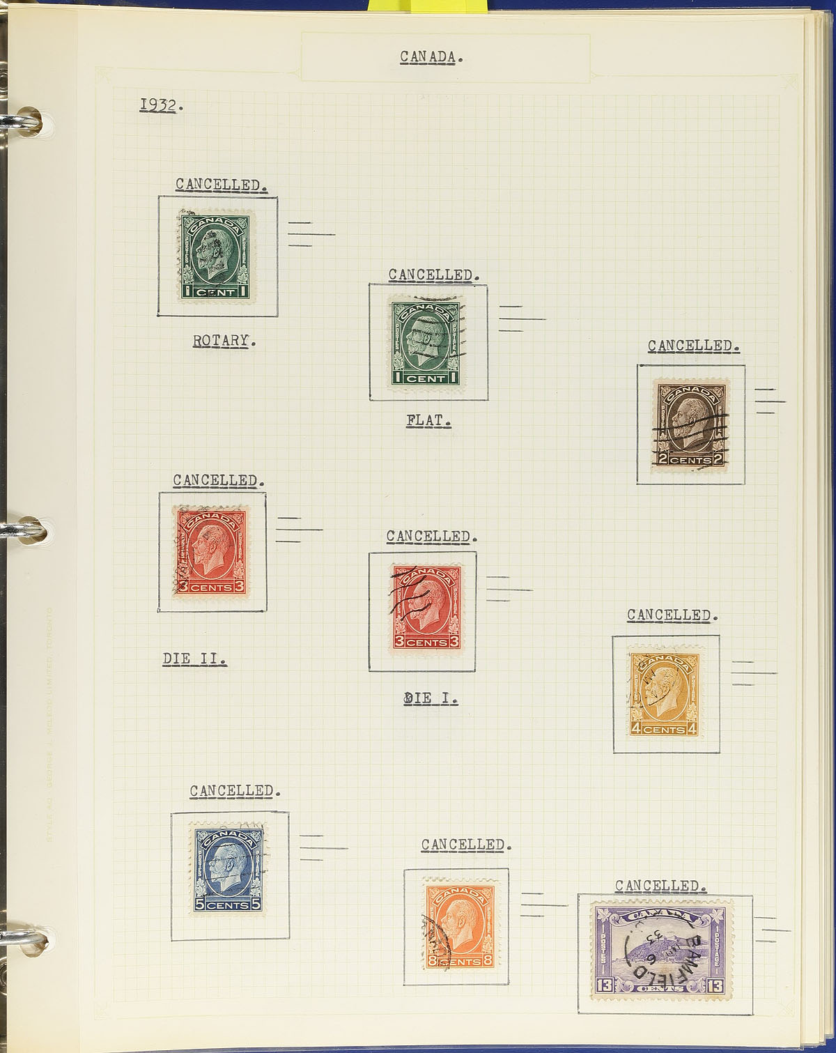 Collection of mint and used Canada, 1870's-1976, containing several hundreds of stamps (probably over 1,000), on a few hundred well described pages, housed in 16 binders. This well organized collection begins with selections of used stamps up to the Edwards, a used set of Admirals, and progress to mint and or used singles, sets and partial sets up to 1950 (the collector made an attempt to get a mint and used example for most issues), noting used sets of Scrolls, War, and Peace issues. The collection includes primarily mint plate blocks, coils, booklet panes, officials post 1950. A spot check indicated stamps and a few sets and partial sets cataloguing $15 and up, with all items appearing to have 2 hinges or more. A well organized collection. Estimate =