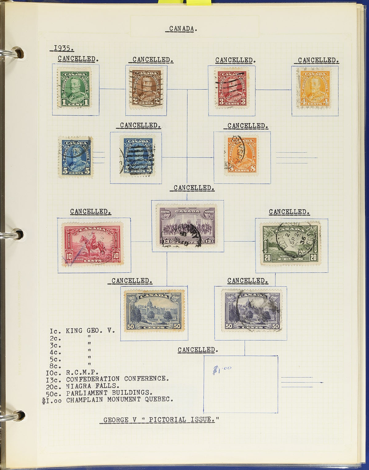 Collection of mint and used Canada, 1870's-1976, containing several hundreds of stamps (probably over 1,000), on a few hundred well described pages, housed in 16 binders. This well organized collection begins with selections of used stamps up to the Edwards, a used set of Admirals, and progress to mint and or used singles, sets and partial sets up to 1950 (the collector made an attempt to get a mint and used example for most issues), noting used sets of Scrolls, War, and Peace issues. The collection includes primarily mint plate blocks, coils, booklet panes, officials post 1950. A spot check indicated stamps and a few sets and partial sets cataloguing $15 and up, with all items appearing to have 2 hinges or more. A well organized collection. Estimate =