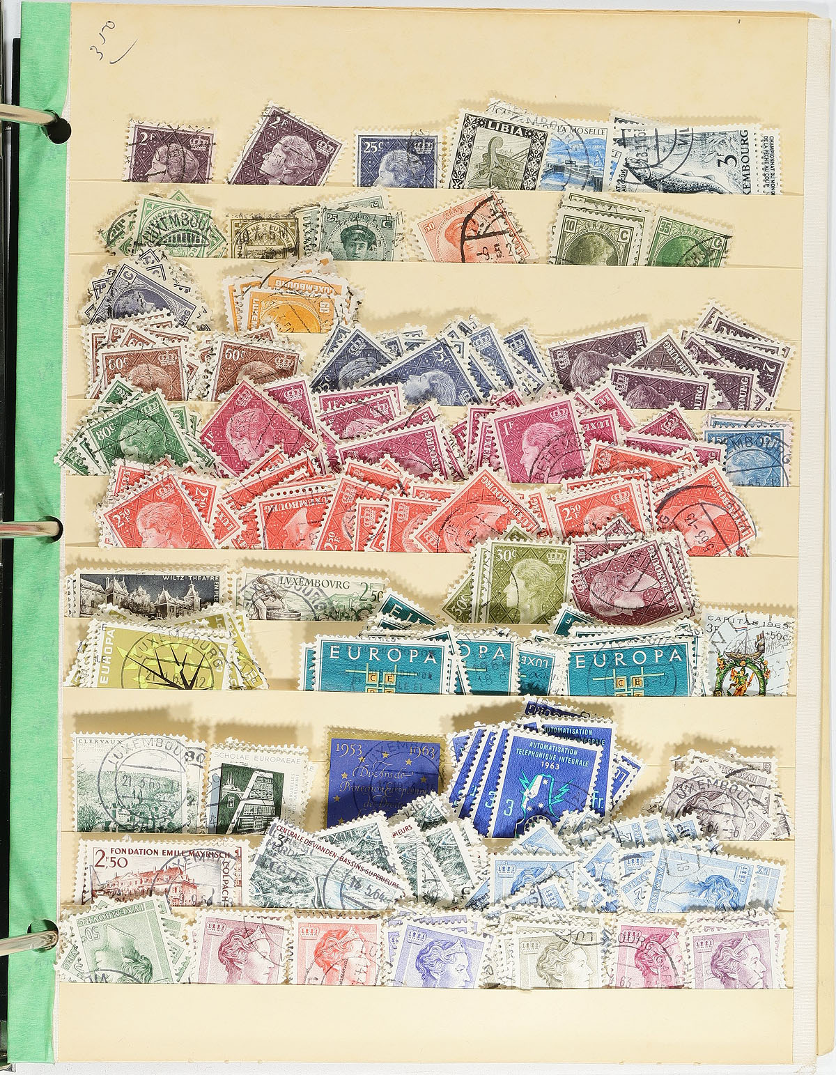 Large collections / accumulations of primarily used worldwide stamps in 22 binders, containing several thousands of stamps, on a few hundred album pages, Vario-style pages, and or manila stock pages. The lot is organized from A to Z countries, with well identified binders, with material generally ranging from the 1890s to the 1970s, with material possible on either side of the given range. A spot check indicated better representation from European and Asian countries, along with some British Commonwealth and more, with a few items cataloguing $10 and up, leaving better finds to the dedicated collector. We took several random photos to show a taste of what is inside the lot. Ideal for the worldwide, topical, and thematic collector. Housed in 3 boxes. Estimate =
