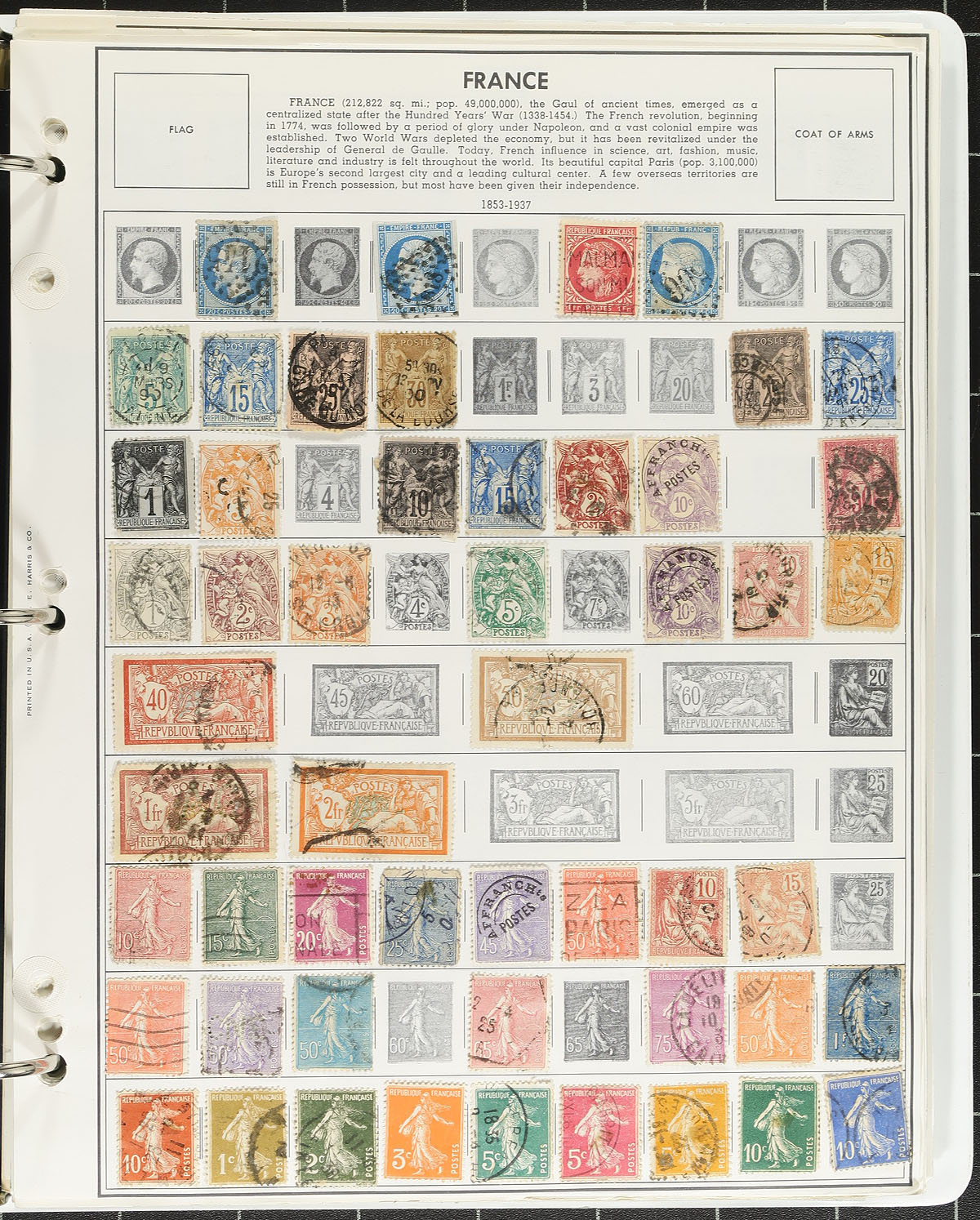 Large collections / accumulations of primarily used worldwide stamps in 22 binders, containing several thousands of stamps, on a few hundred album pages, Vario-style pages, and or manila stock pages. The lot is organized from A to Z countries, with well identified binders, with material generally ranging from the 1890s to the 1970s, with material possible on either side of the given range. A spot check indicated better representation from European and Asian countries, along with some British Commonwealth and more, with a few items cataloguing $10 and up, leaving better finds to the dedicated collector. We took several random photos to show a taste of what is inside the lot. Ideal for the worldwide, topical, and thematic collector. Housed in 3 boxes. Estimate =