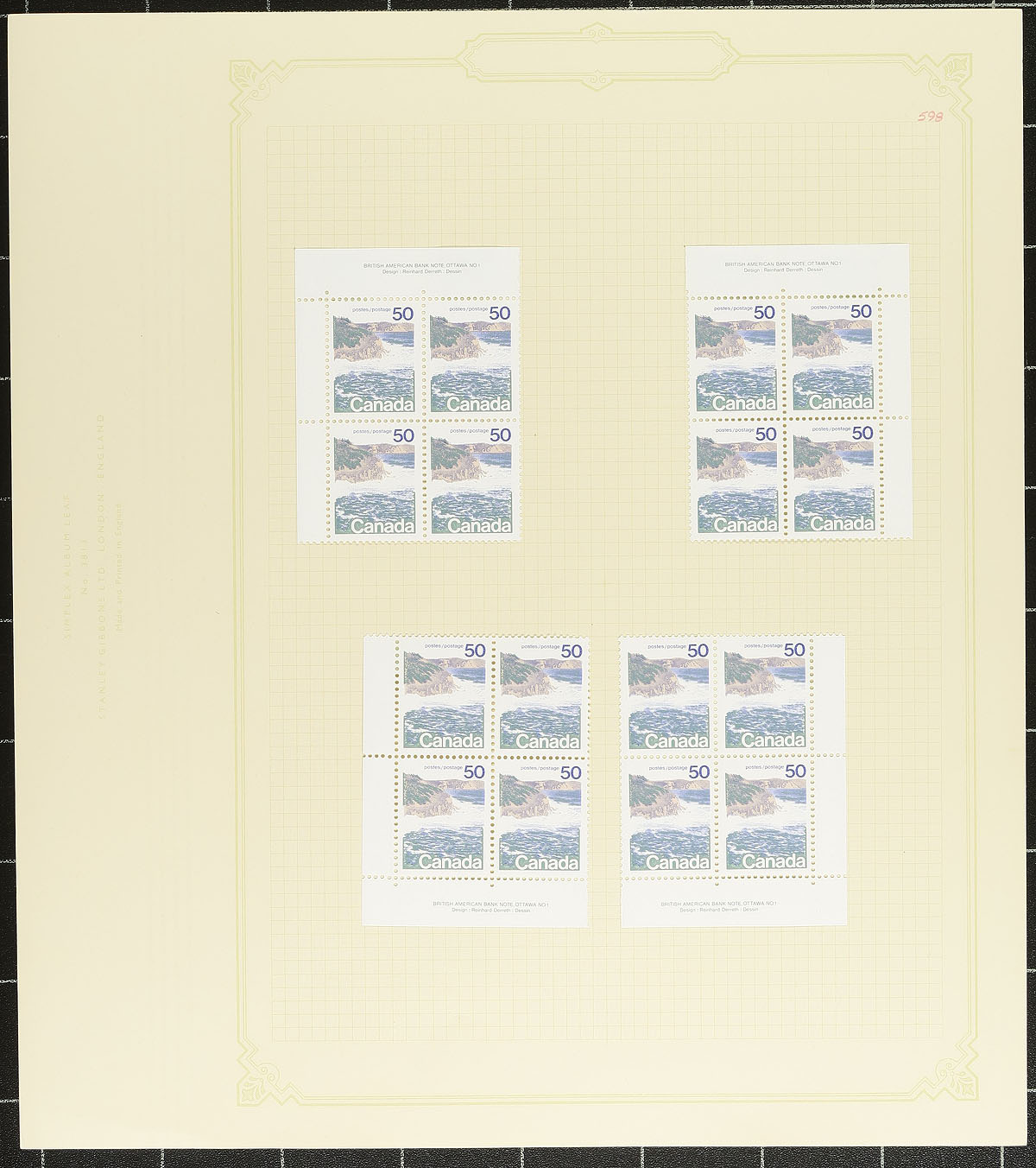 Collection of mint Canada matched set plate blocks, 1962-1973, on a few hundred pages. The collection ranges from Scott #396/628, and includes additional plate numbers for some issues. Face value for the collection totals $229.00 (denominations range from 5c up to $1). We note every plate block appears to have the upper two stamps hinged to the page. A nice lot for the plate block collector or postage user. Conservatively valued for the usable face value alone. Total face value =