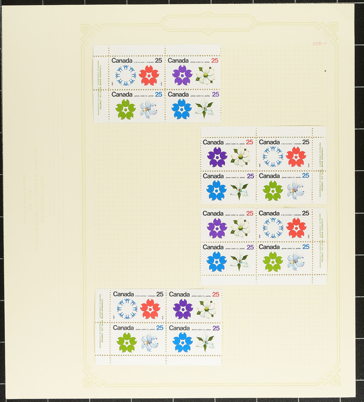 Collection of mint Canada matched set plate blocks, 1962-1973, on a few hundred pages. The collection ranges from Scott #396/628, and includes additional plate numbers for some issues. Face value for the collection totals $229.00 (denominations range from 5c up to $1). We note every plate block appears to have the upper two stamps hinged to the page. A nice lot for the plate block collector or postage user. Conservatively valued for the usable face value alone. Total face value =