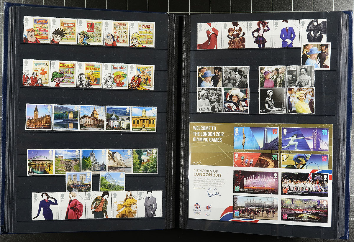 Varied collection of mint never hinged and used Great Britain, containing many hundreds of stamps, in a 64 page Lighthouse stockbook with slipcase. The begins with roughly 10 pages of mint material, mostly post 2012, along with a few earlier issues, noting 83x 1ST stamps (face value £1.70 each, we estimate £175 of face value for the collection), with the remainder of the collection having used modern issues (generally 2013-2018), including several sets, booklet stamps, and souvenir sheets. A nice lot for the modern Great Britain used collector, with the face value as an added bonus. All pages photographed. Estimate =