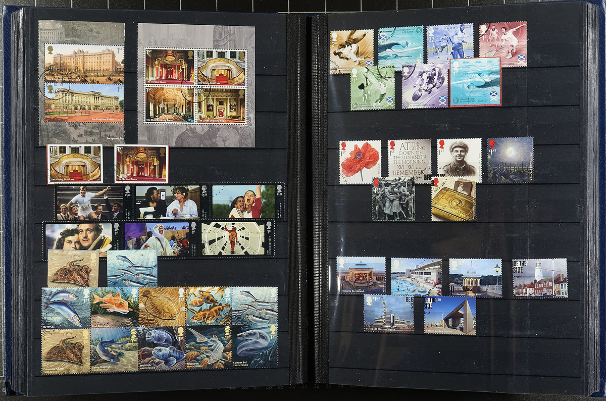Varied collection of mint never hinged and used Great Britain, containing many hundreds of stamps, in a 64 page Lighthouse stockbook with slipcase. The begins with roughly 10 pages of mint material, mostly post 2012, along with a few earlier issues, noting 83x 1ST stamps (face value £1.70 each, we estimate £175 of face value for the collection), with the remainder of the collection having used modern issues (generally 2013-2018), including several sets, booklet stamps, and souvenir sheets. A nice lot for the modern Great Britain used collector, with the face value as an added bonus. All pages photographed. Estimate =