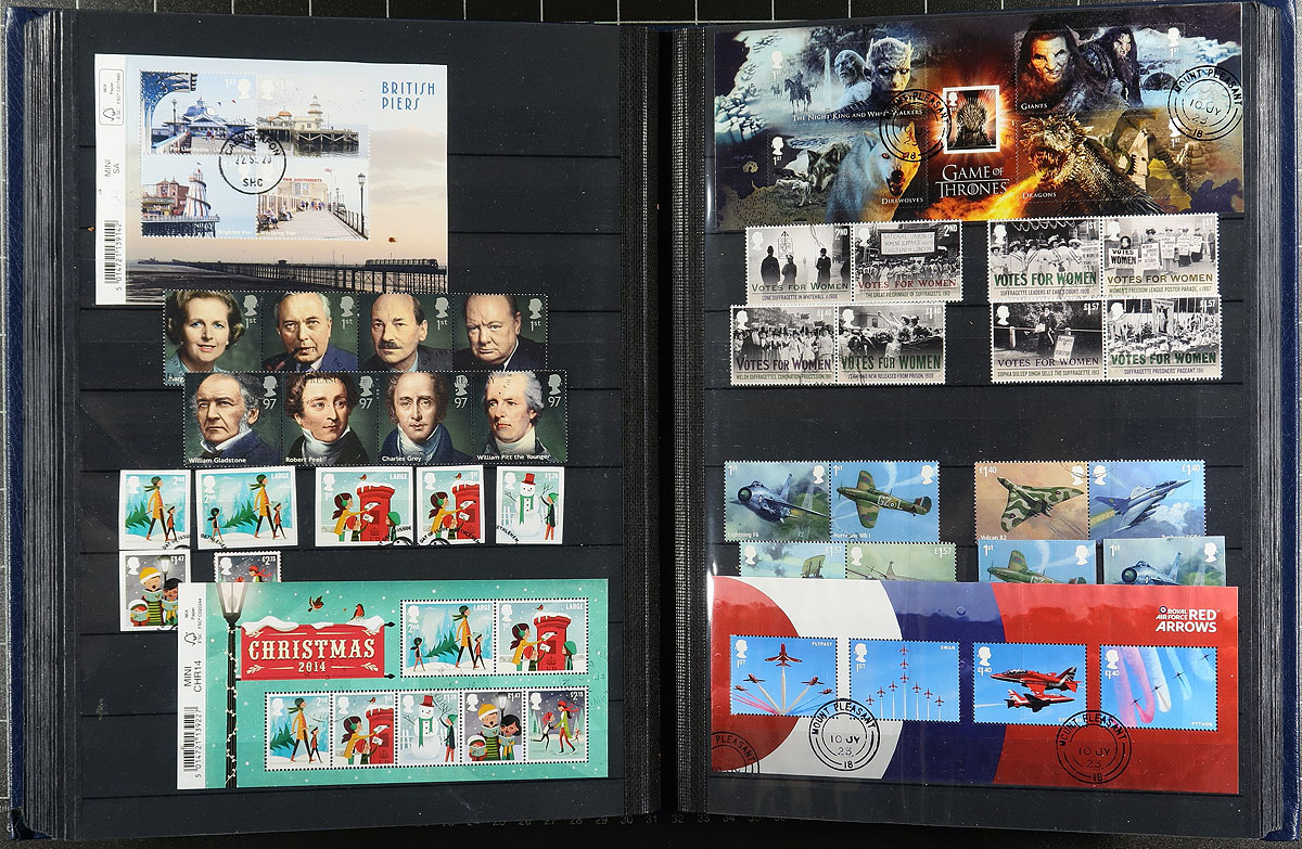 Varied collection of mint never hinged and used Great Britain, containing many hundreds of stamps, in a 64 page Lighthouse stockbook with slipcase. The begins with roughly 10 pages of mint material, mostly post 2012, along with a few earlier issues, noting 83x 1ST stamps (face value £1.70 each, we estimate £175 of face value for the collection), with the remainder of the collection having used modern issues (generally 2013-2018), including several sets, booklet stamps, and souvenir sheets. A nice lot for the modern Great Britain used collector, with the face value as an added bonus. All pages photographed. Estimate =