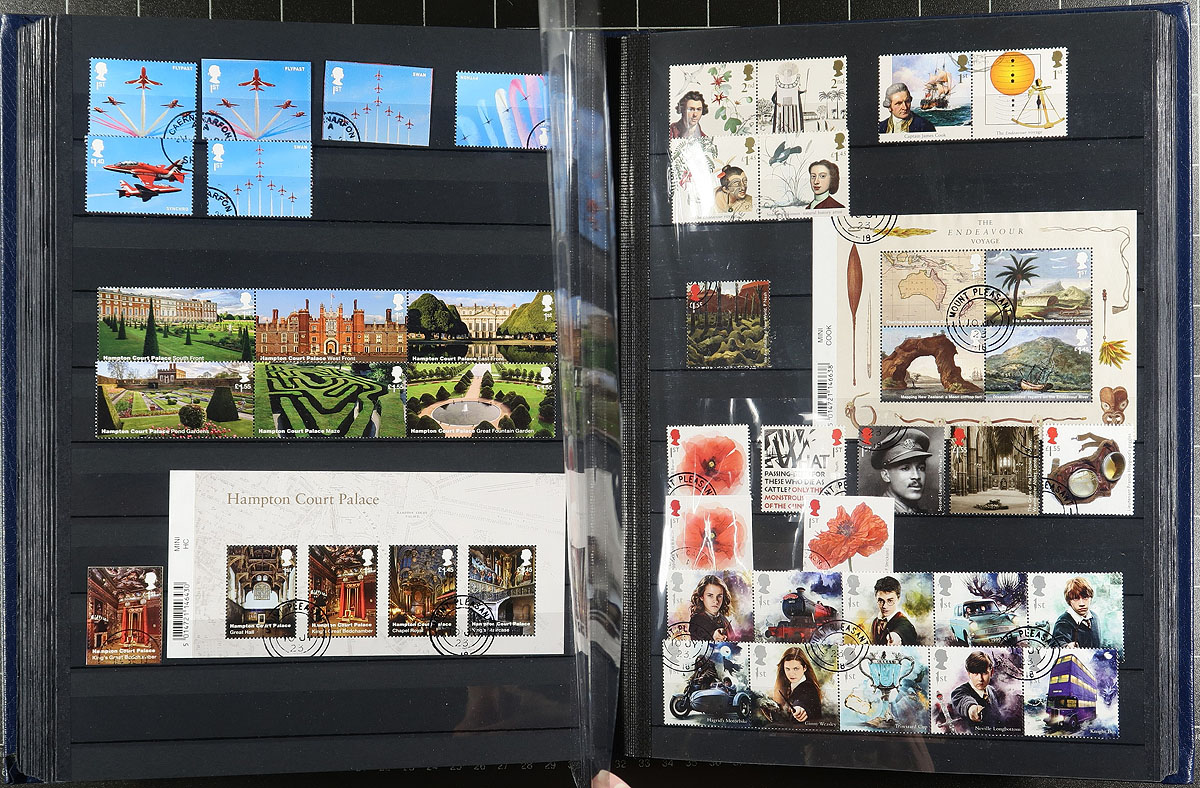 Varied collection of mint never hinged and used Great Britain, containing many hundreds of stamps, in a 64 page Lighthouse stockbook with slipcase. The begins with roughly 10 pages of mint material, mostly post 2012, along with a few earlier issues, noting 83x 1ST stamps (face value £1.70 each, we estimate £175 of face value for the collection), with the remainder of the collection having used modern issues (generally 2013-2018), including several sets, booklet stamps, and souvenir sheets. A nice lot for the modern Great Britain used collector, with the face value as an added bonus. All pages photographed. Estimate =