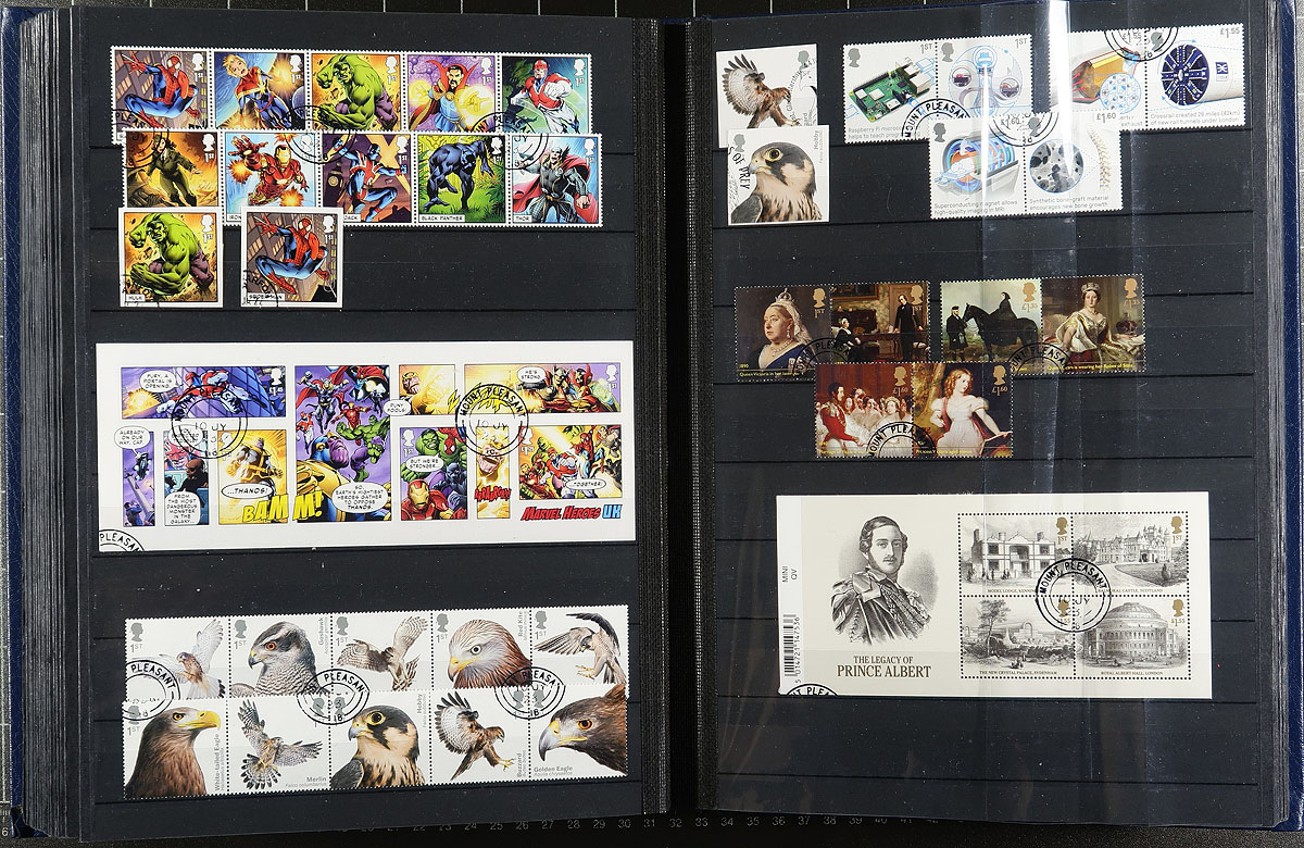 Varied collection of mint never hinged and used Great Britain, containing many hundreds of stamps, in a 64 page Lighthouse stockbook with slipcase. The begins with roughly 10 pages of mint material, mostly post 2012, along with a few earlier issues, noting 83x 1ST stamps (face value £1.70 each, we estimate £175 of face value for the collection), with the remainder of the collection having used modern issues (generally 2013-2018), including several sets, booklet stamps, and souvenir sheets. A nice lot for the modern Great Britain used collector, with the face value as an added bonus. All pages photographed. Estimate =
