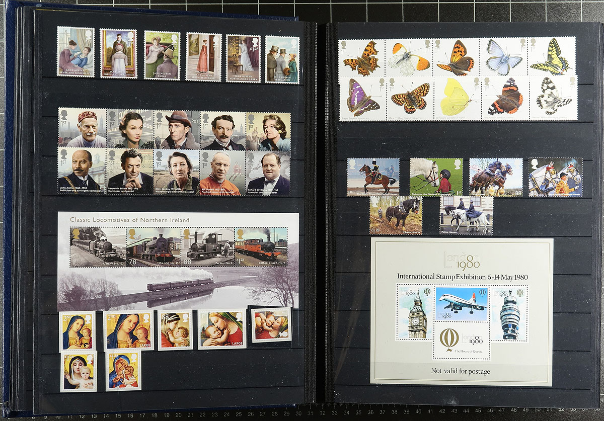 Varied collection of mint never hinged and used Great Britain, containing many hundreds of stamps, in a 64 page Lighthouse stockbook with slipcase. The begins with roughly 10 pages of mint material, mostly post 2012, along with a few earlier issues, noting 83x 1ST stamps (face value £1.70 each, we estimate £175 of face value for the collection), with the remainder of the collection having used modern issues (generally 2013-2018), including several sets, booklet stamps, and souvenir sheets. A nice lot for the modern Great Britain used collector, with the face value as an added bonus. All pages photographed. Estimate =