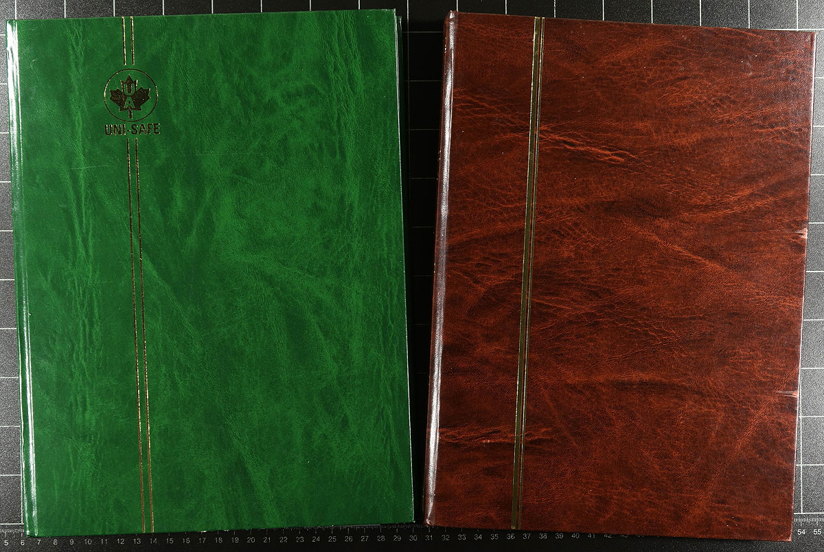 Group of gently used and like new stockbooks and albums filling a bankers box. The lot includes 8 stockbooks with various configurations and 5 clean albums with 18 manila pages each. A useful lot waiting for a new collector, with retail cost on these items always on the rise. Estimate =