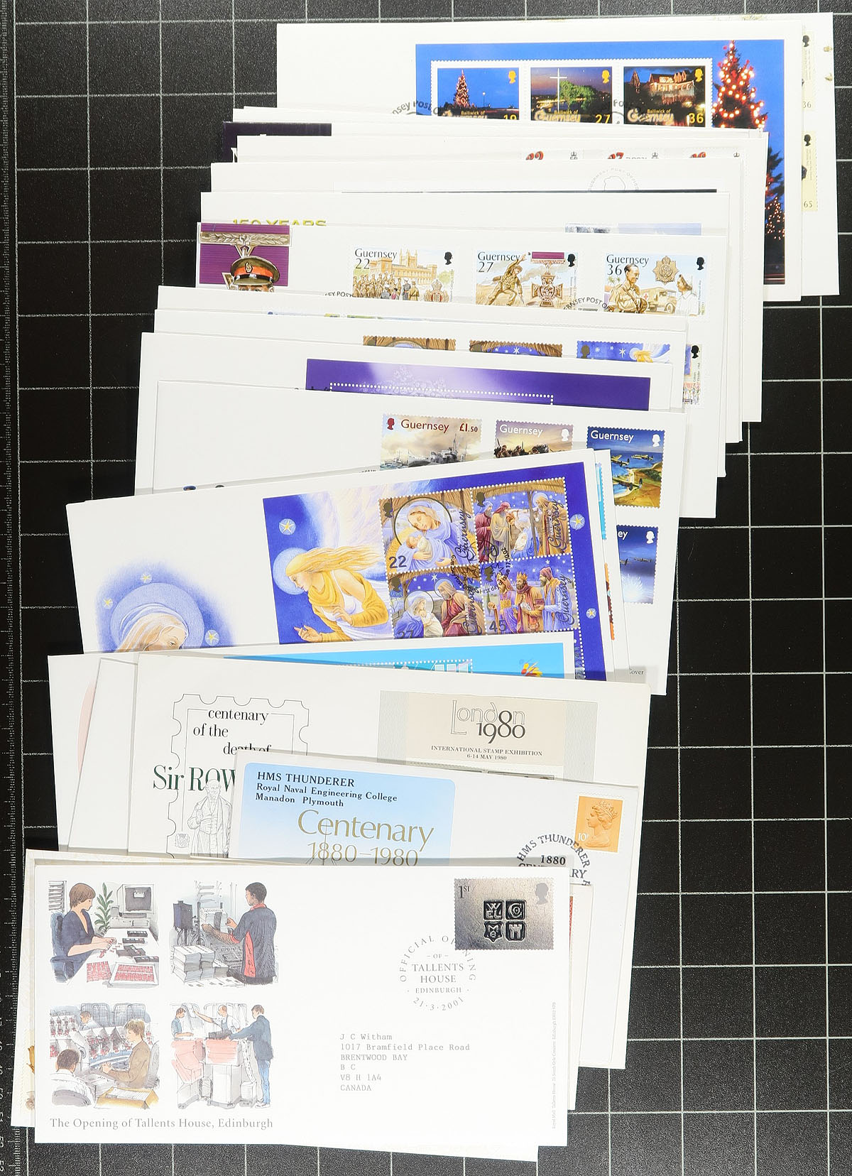 Colourful group of roughly 150 first day cover, 1980’s-2000’s, with roughly 110 Guernsey (1990’s-2000’s) and 40 Great Britian (1980’s), noting primarily sets and souvenir sheet frankings, along with a numismatic first day. A lovely group noting many thematic and topical subject, overall very fine. Estimate =