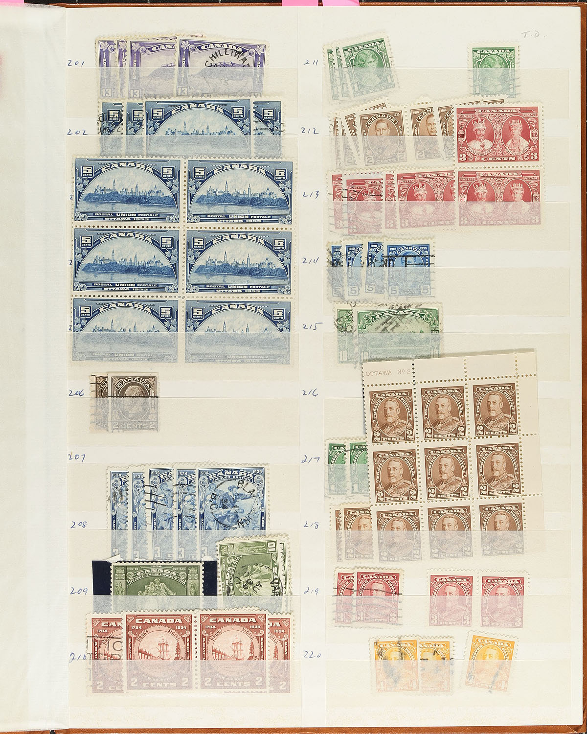 Stock of mint and used Canada, 1870’s-1970, with many hundreds of stamps in a stockbook. The stamps generally range from Scott #34/518, including primarily used low denomination Small Queens up to the Quebecs, continuing with a bit of a mixture of mint and used from the Admirals to the 1950’s, with mostly mint material thereafter. A few of the better items include #s 41 3c Small Queen (x2, nh and lh, c.v. $130 total), 115 (nh, $100), 152 (x2. nh, $80 total), along with some items cataloguing $10 and up. A spot check indicated most mint items up to 1950 are mint hinged or have no gum. Still a nice lot with plenty of value, and a few socked on the nose cancels. Estimate =
