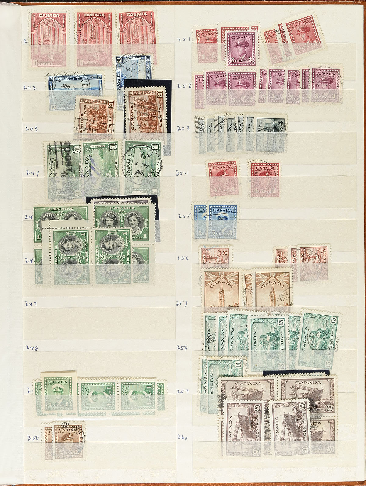 Stock of mint and used Canada, 1870’s-1970, with many hundreds of stamps in a stockbook. The stamps generally range from Scott #34/518, including primarily used low denomination Small Queens up to the Quebecs, continuing with a bit of a mixture of mint and used from the Admirals to the 1950’s, with mostly mint material thereafter. A few of the better items include #s 41 3c Small Queen (x2, nh and lh, c.v. $130 total), 115 (nh, $100), 152 (x2. nh, $80 total), along with some items cataloguing $10 and up. A spot check indicated most mint items up to 1950 are mint hinged or have no gum. Still a nice lot with plenty of value, and a few socked on the nose cancels. Estimate =