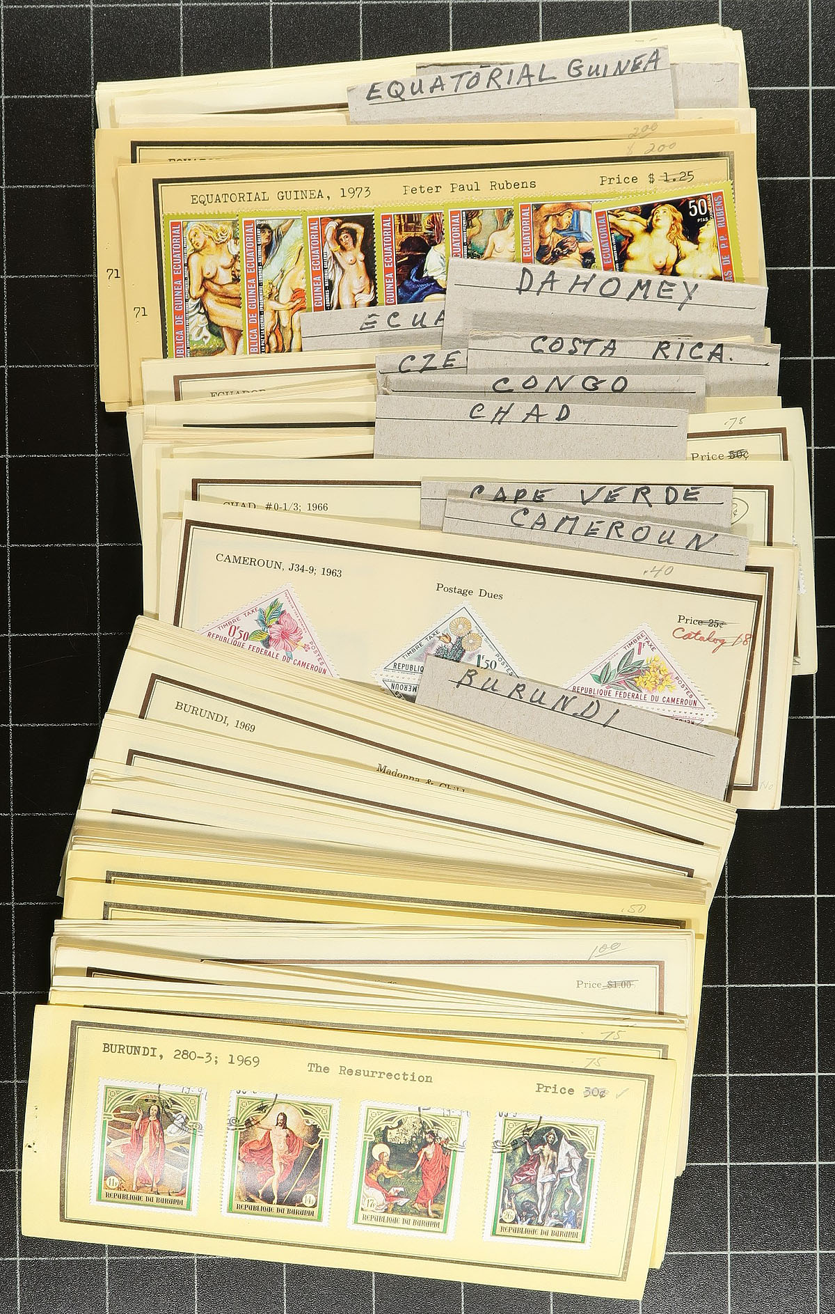 Accumulation of topical and thematic material on hundreds of approval pages or books, containing used sets depicting animals, flowers, insects, religious art, famous people, ships, and much more. We note representation from roughly 20 different issuing countries generally ranging from H to T countries, with material appearing to range from the 1970’s. Duplication appears to be from 5 to 10 for some sets. A few small faults with a few of the sets, overall fine to very fine. Estimate =