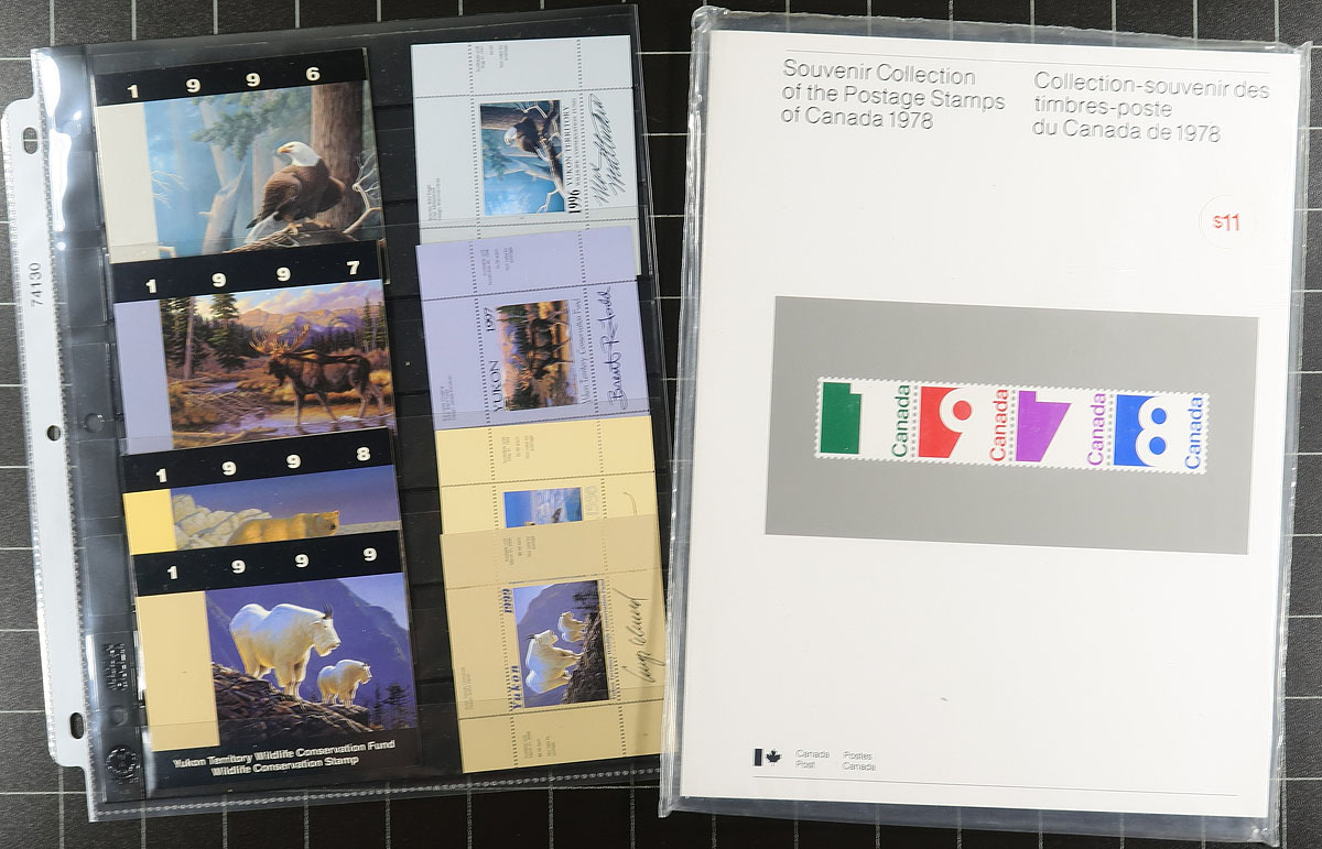 Mint and used "catch all", noting a wide variety of material ranging from Large Queens to the modern era, in glassines, 102 cards, album pages, and more. We note Yukon Wildlife signed single stamps from 1996-1999 (c.v. $110), accumulation of 3c Small Queens, mint booklets and plate blocks (we estimate $75 of face value stamps), sealed year sets from 1978, and a few sheets, and much more. Our photos show an overview of the lot. An interesting lot for all Canada collectors. Estimate =