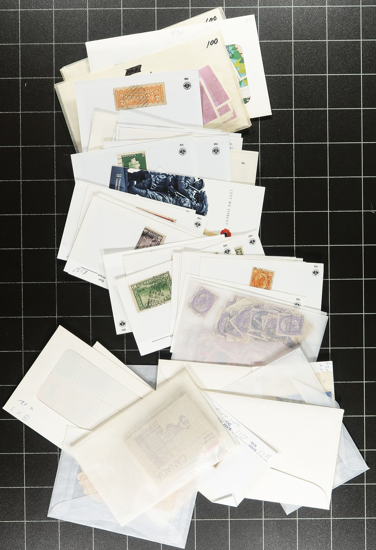 Mint and used "catch all", noting a wide variety of material ranging from Large Queens to the modern era, in glassines, 102 cards, album pages, and more. We note Yukon Wildlife signed single stamps from 1996-1999 (c.v. $110), accumulation of 3c Small Queens, mint booklets and plate blocks (we estimate $75 of face value stamps), sealed year sets from 1978, and a few sheets, and much more. Our photos show an overview of the lot. An interesting lot for all Canada collectors. Estimate =