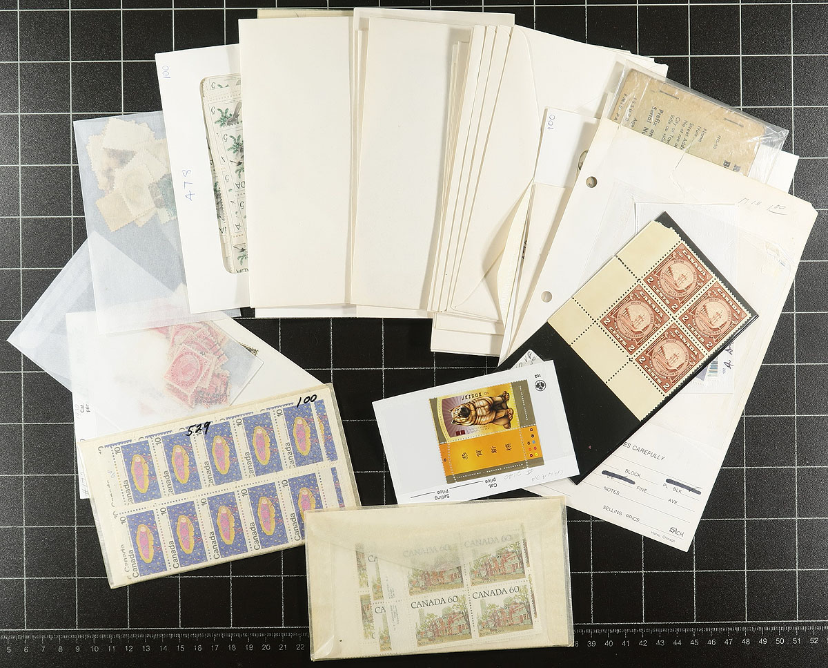 Mint and used "catch all", noting a wide variety of material ranging from Large Queens to the modern era, in glassines, 102 cards, album pages, and more. We note Yukon Wildlife signed single stamps from 1996-1999 (c.v. $110), accumulation of 3c Small Queens, mint booklets and plate blocks (we estimate $75 of face value stamps), sealed year sets from 1978, and a few sheets, and much more. Our photos show an overview of the lot. An interesting lot for all Canada collectors. Estimate =