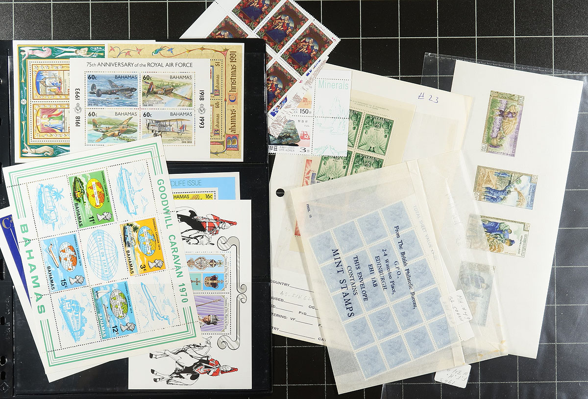 Group of primarily mint never hinged worldwide items in a variety of formats, containing a few hundred items including roughly 50 souvenir sheets, sets, panes, and more, in glassines, Vario-style pages, stockpages, etc. Most of the material appears to be from the 1960’s to the 1990’s, with some items priced for retail ranging from $3 to $5 and up each, with better representation from British Commonwealth and European countries. Online photos show an overview. A lot for all collectors. Estimate =