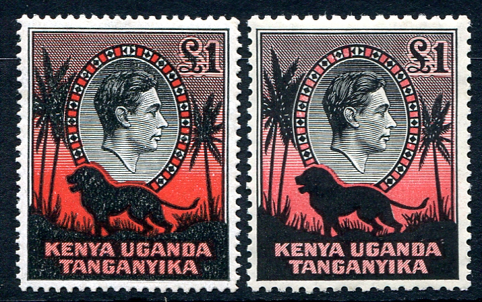 VF mint Lightly hinged duo of the £1.00 black and scarlet George VI high-values, featuring the regular issue perf 14, but also the scarce sub-listed perf 11.5x13 (Scott #85a, listed as Gibbons #150 at £500.00!). A very tough perforation variety to find, especially this nice. 2025 Scott US$325.00 =