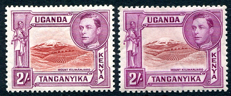 VF mint Lightly hinged duo of the 2sh red violet and orange George VI values, featuring the regular issue perf 13.5x13, but also the tougher sub-listed perf 13 (Scott #81a, listed as Gibbons #146 at £130.00!). It is interesting to see the shade variety difference in the printings (printed in 1938 and 1941), which Gibbons acknowledges, but not mentioned in Scott catalogue. 2025 Scott US$150.00 =